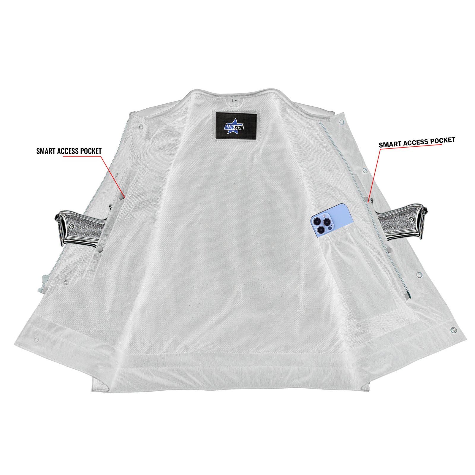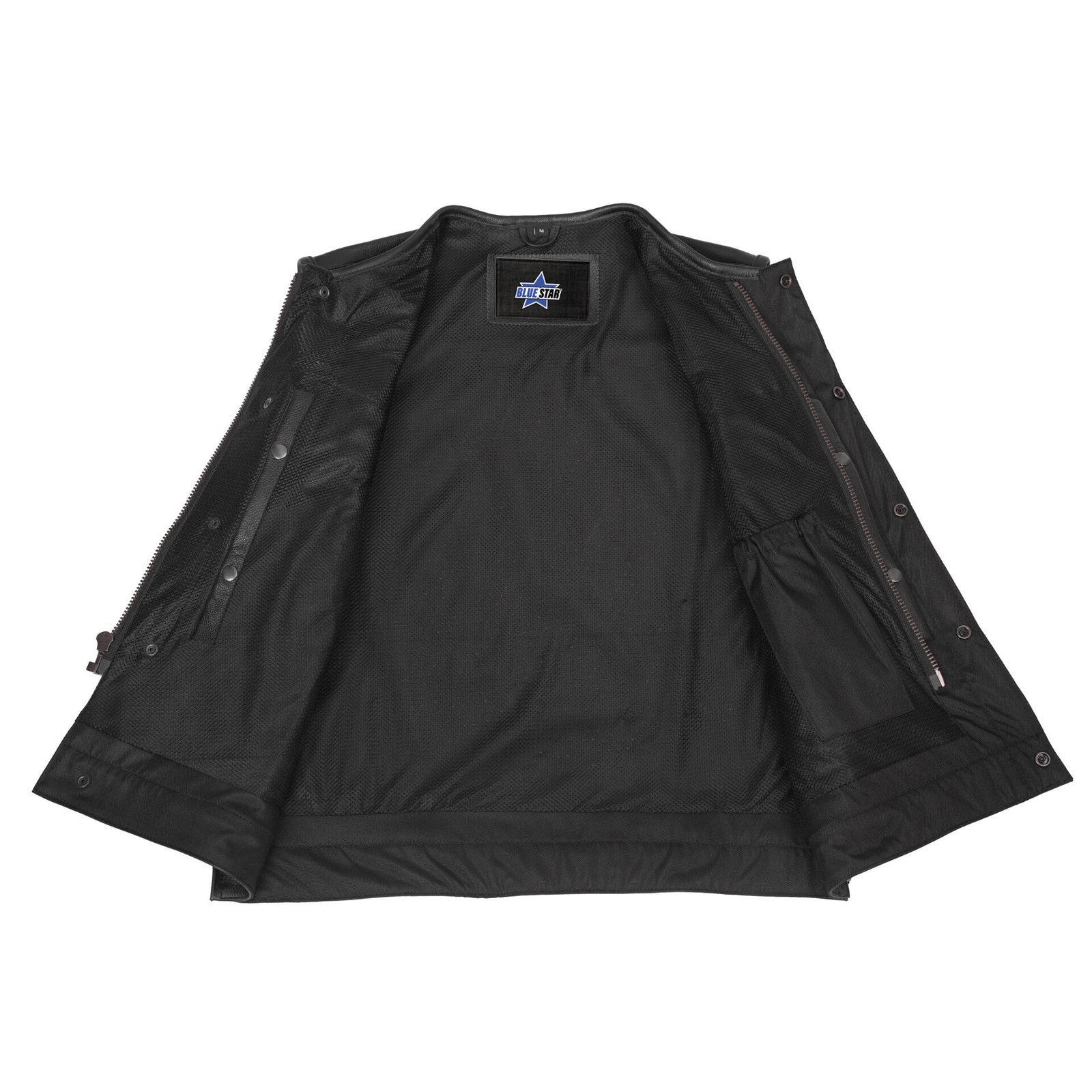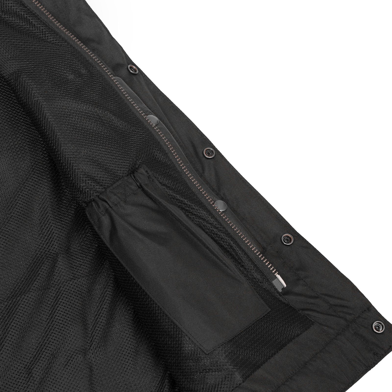 The concealment pockets are located between the snap and zippers for extra security. They are made from durable textile and contain holsters and snap closures. You can ride safely with our men’s perforated single back panel concealment vest.