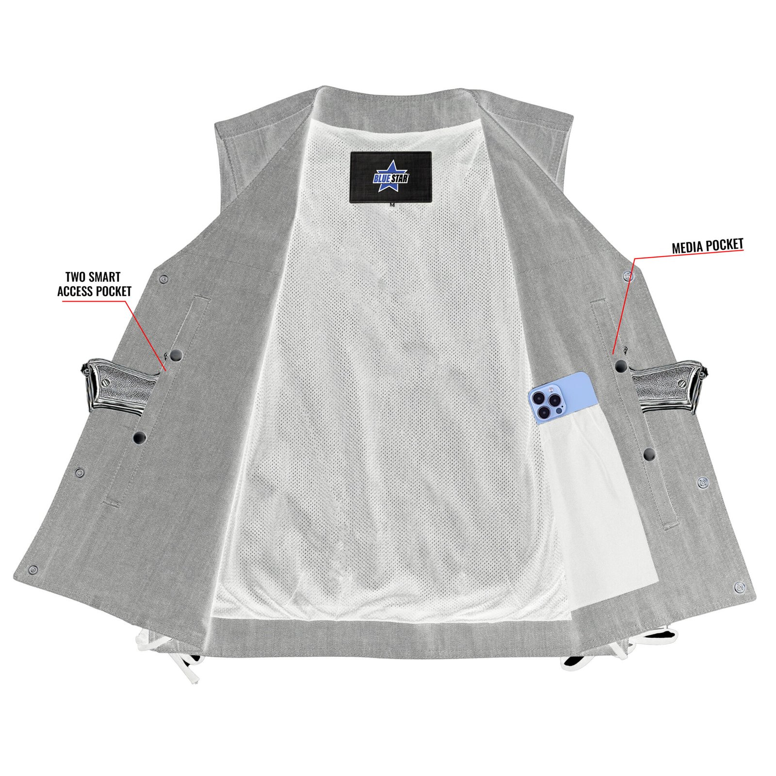 2 inside concealed gun pockets made of special heavy-duty textile with built-in holsters and snap closure.