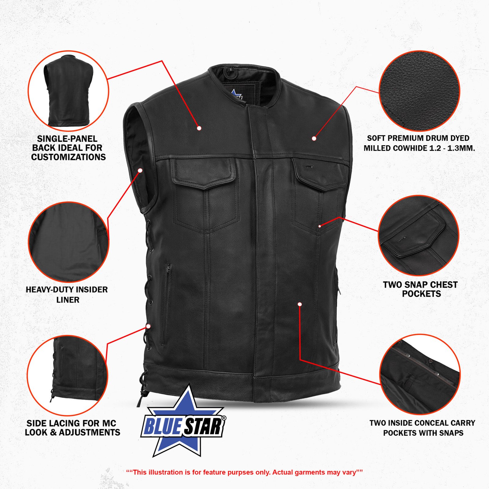 Our leather vest is made from soft, premium drum-dyed milled naked cowhide 1.2 – 1.3mm for comfort and durability. The single back panel is customizable with patches and airbrushed artwork.
