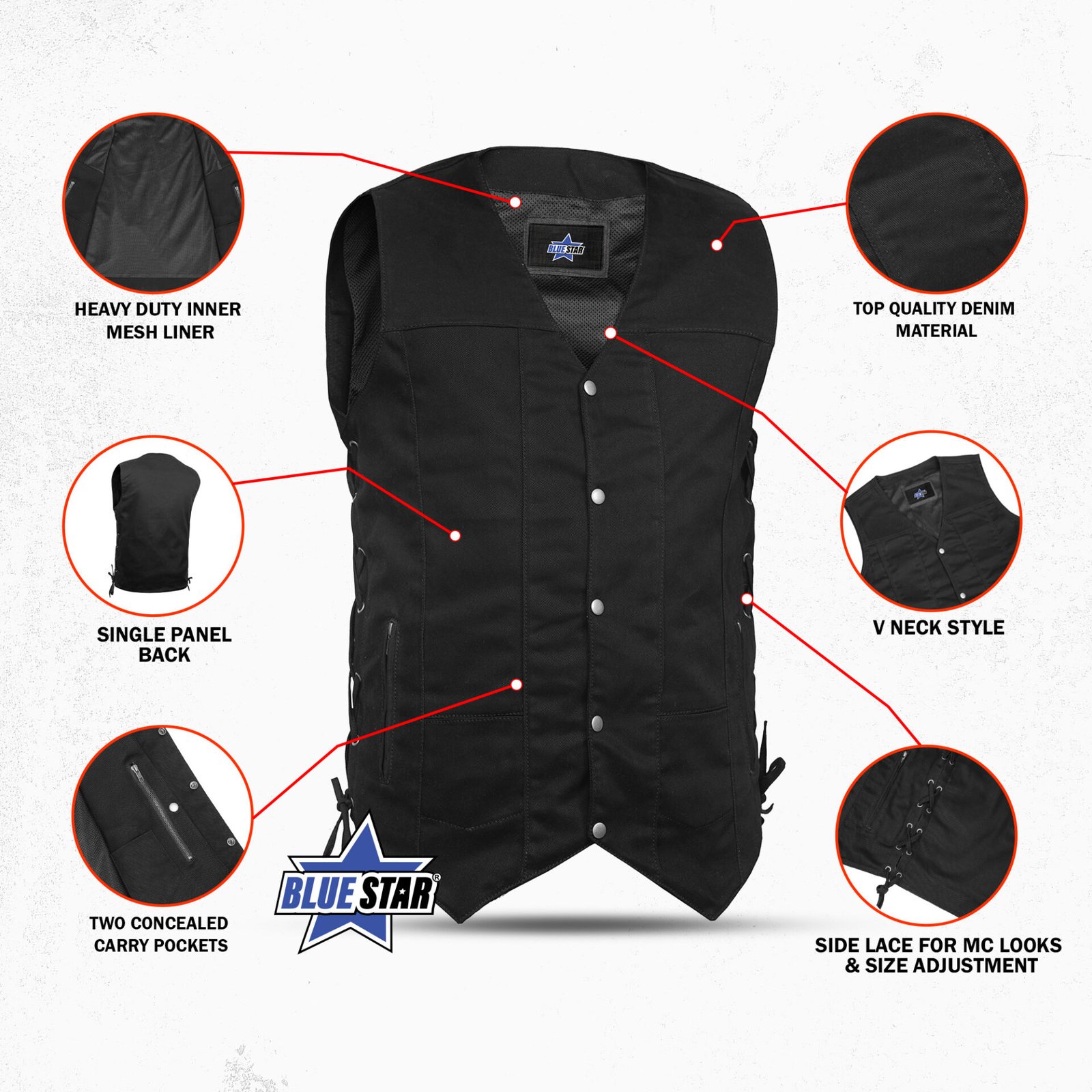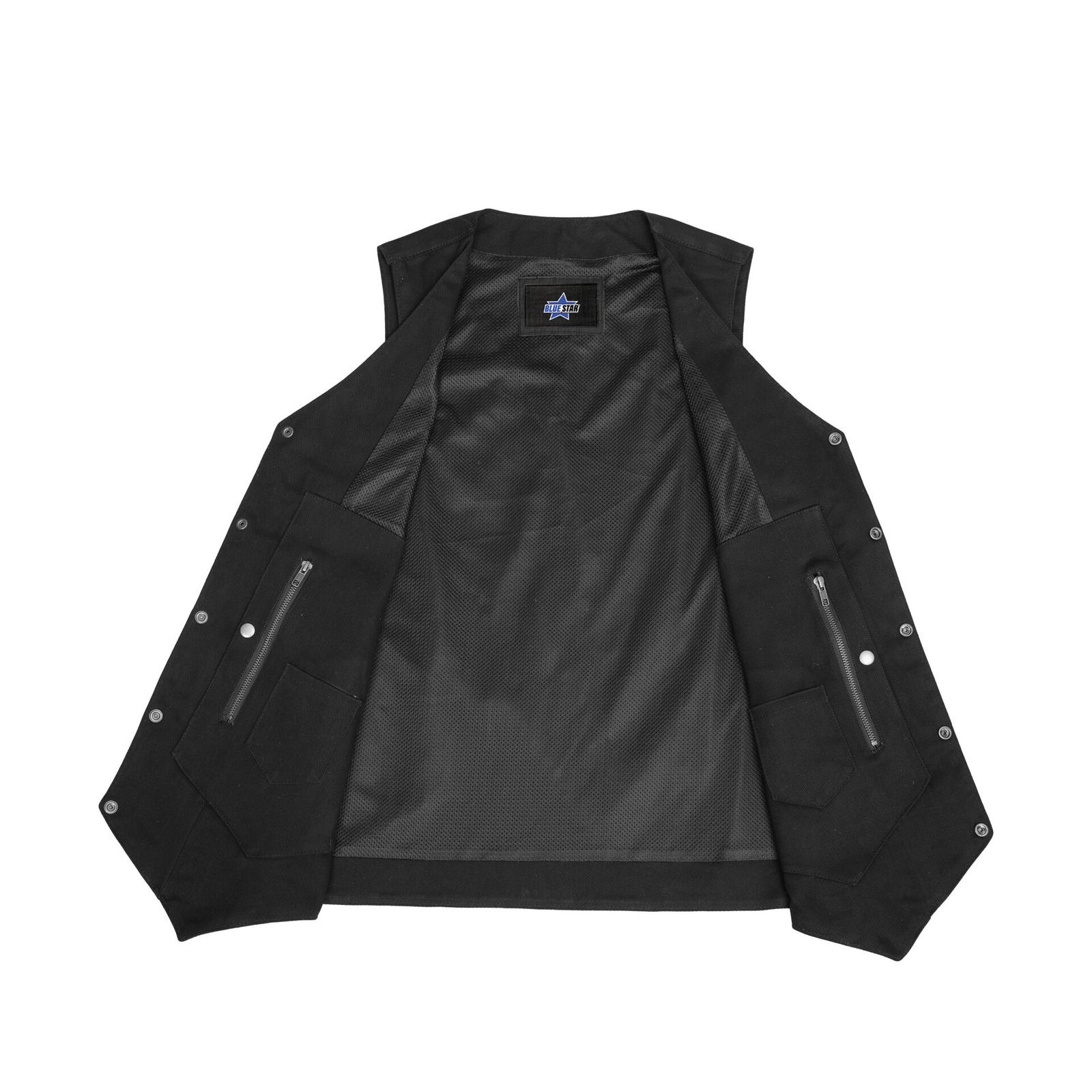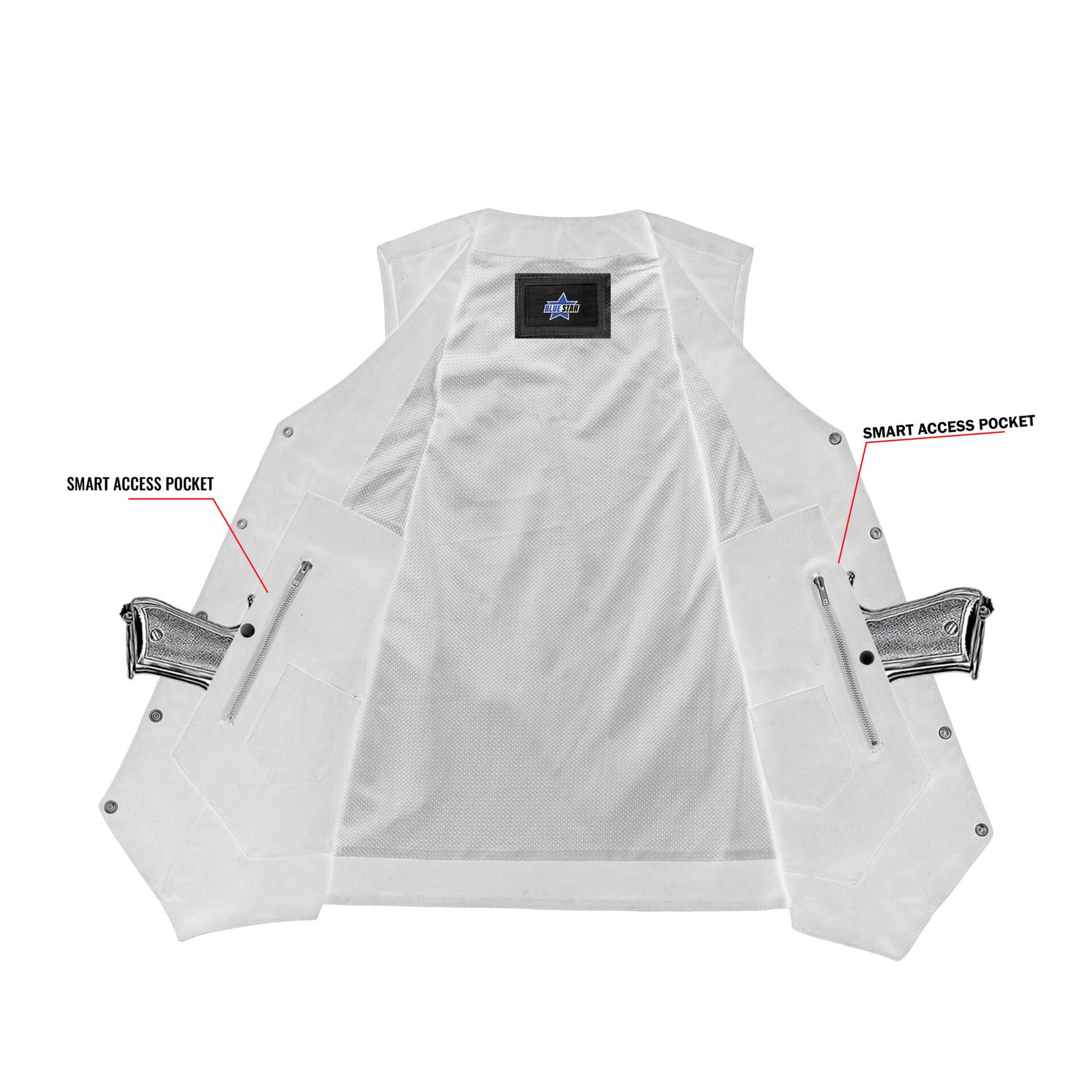 Built in dual side concealed gun pockets with built-in holsters and snap closure.