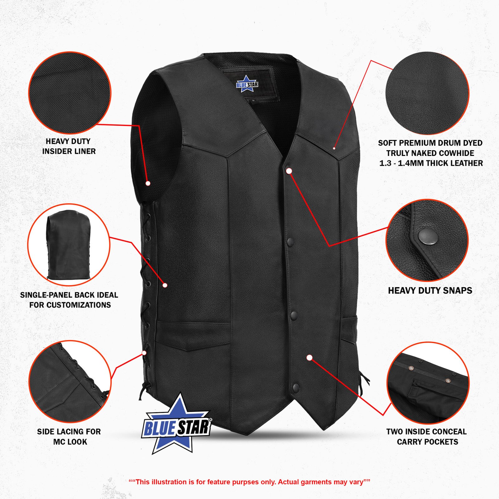 2 inside concealed gun pockets made of special heavy-duty textile with built-in holsters and snap closure.