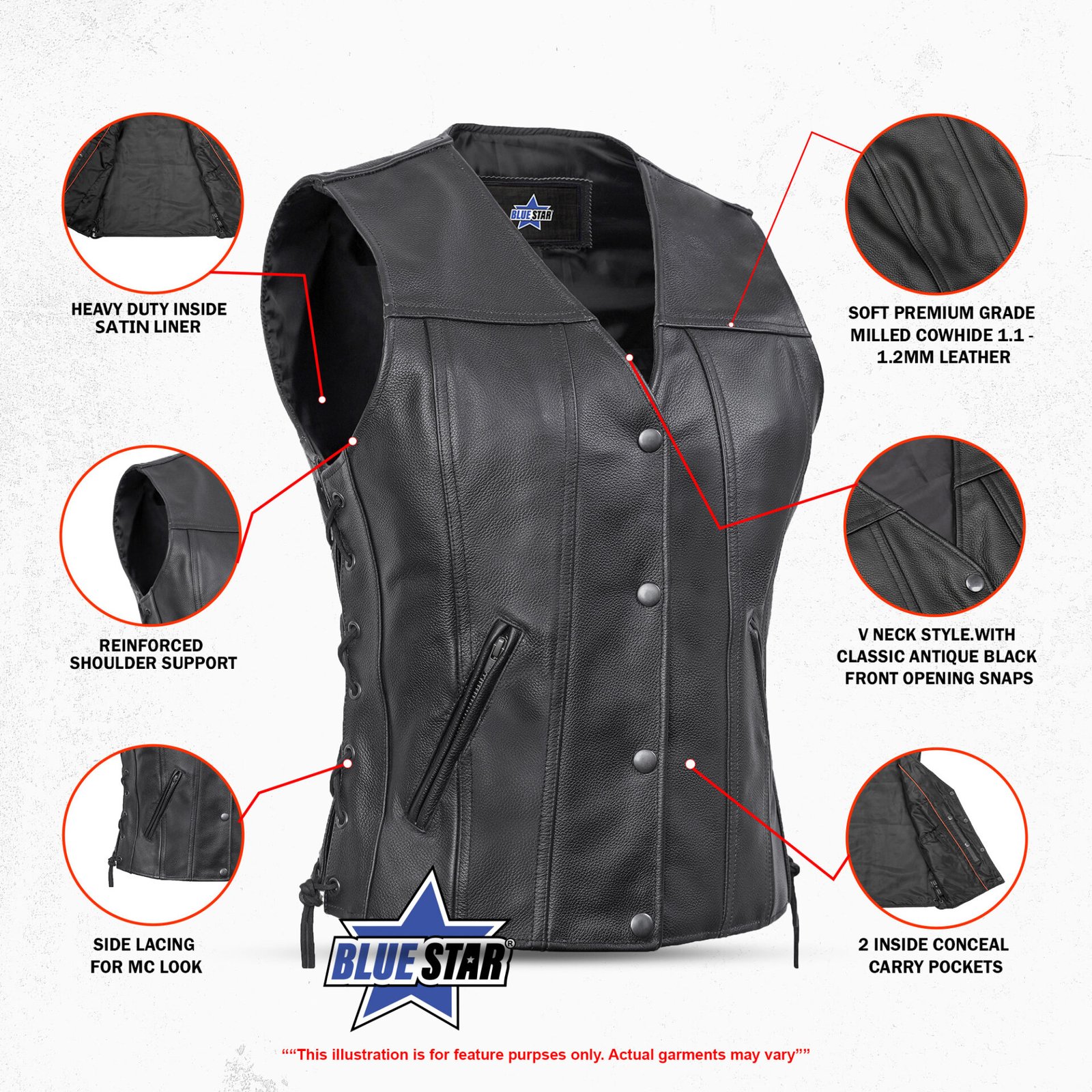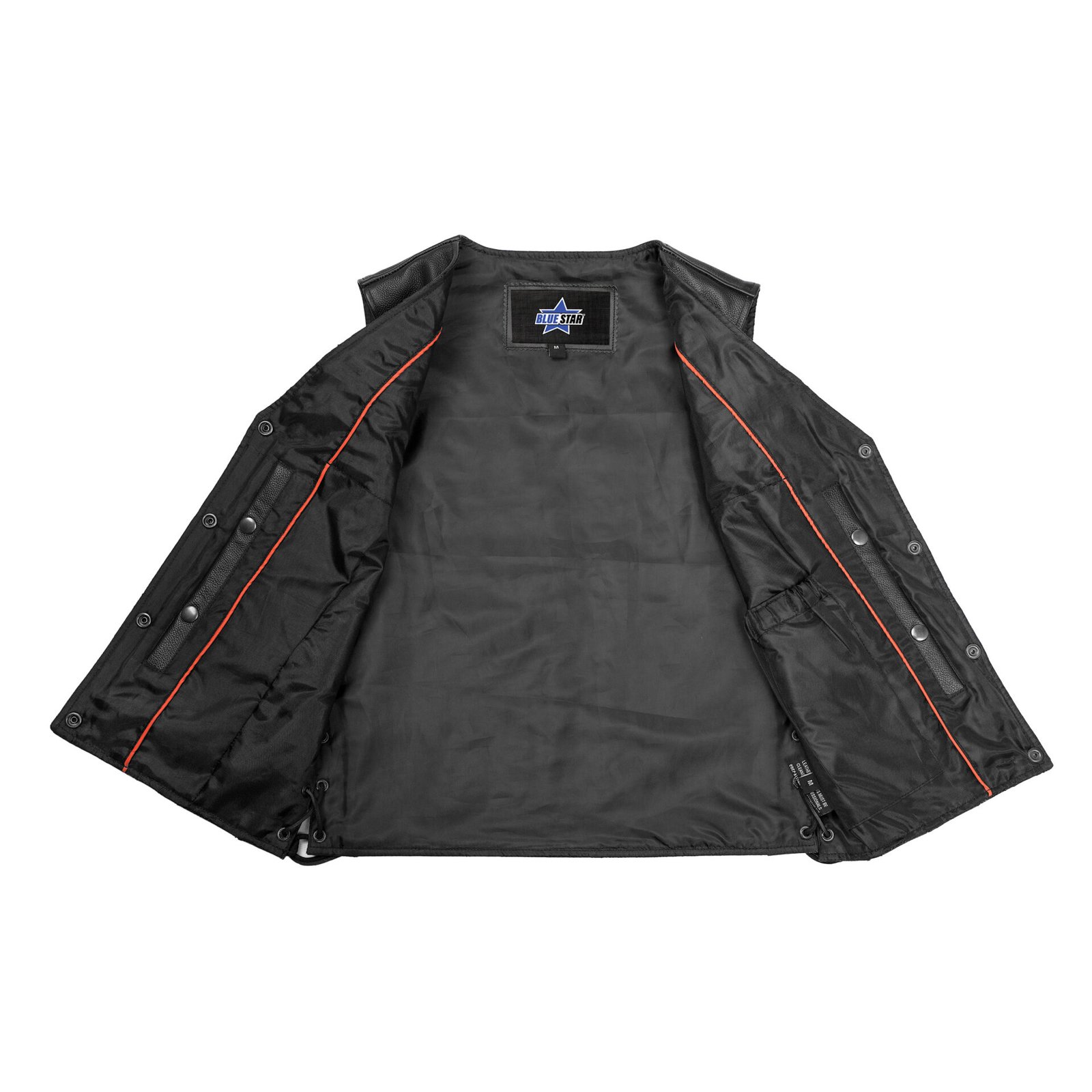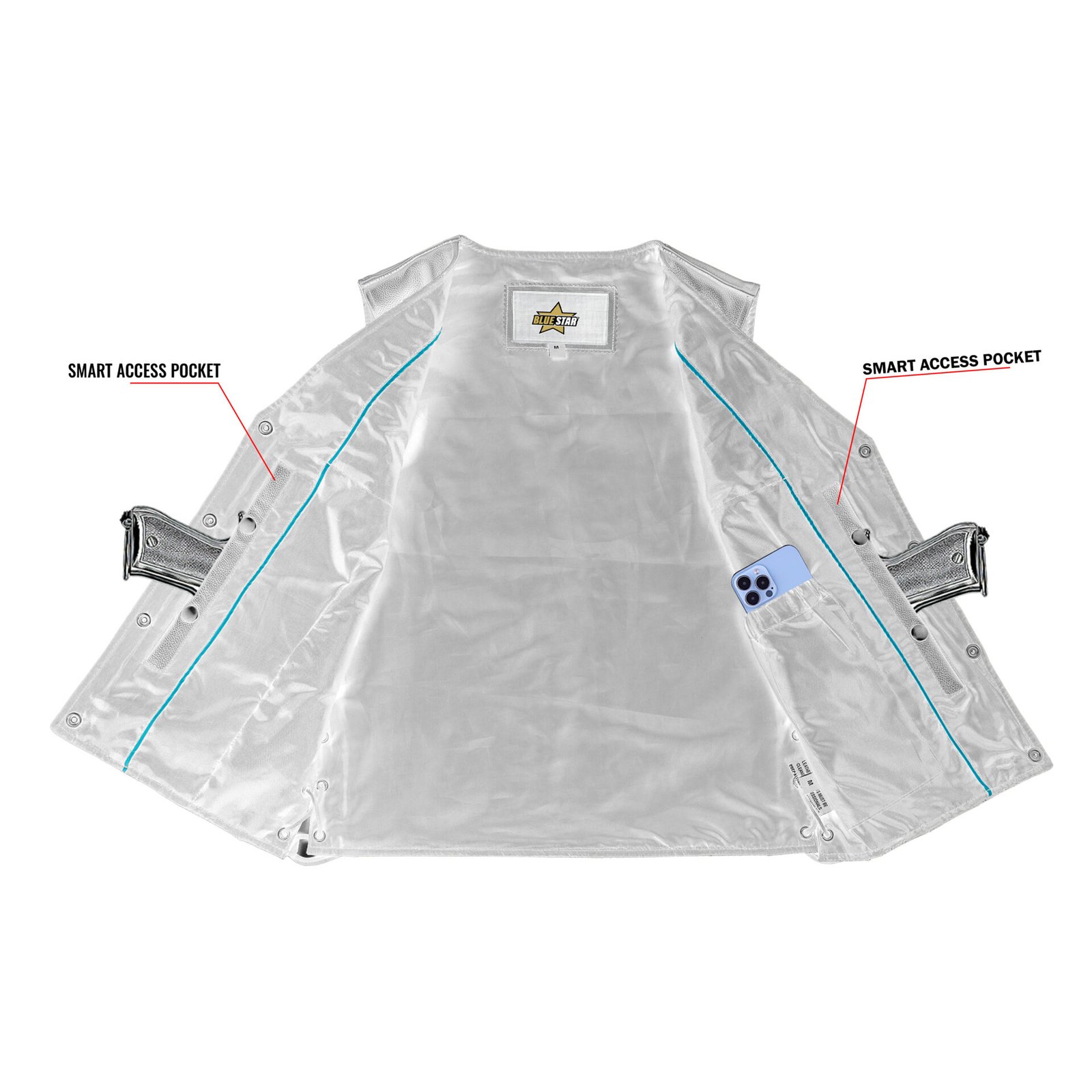 2 inside concealed gun pockets made of special heavy duty textile with built-in holsters and snap closure.