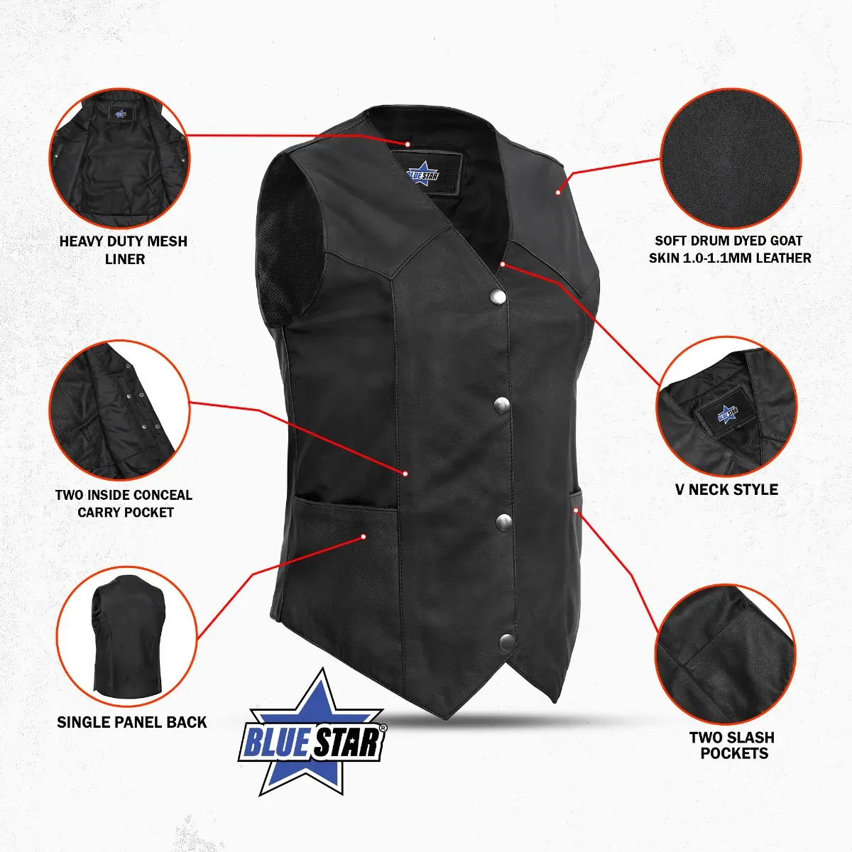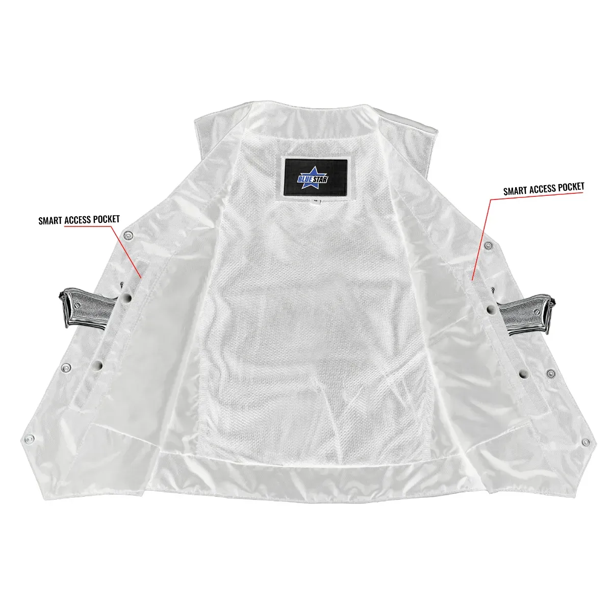 2 inside concealed gun pockets made of special heavy duty textile with built-in holsters and snap closure.