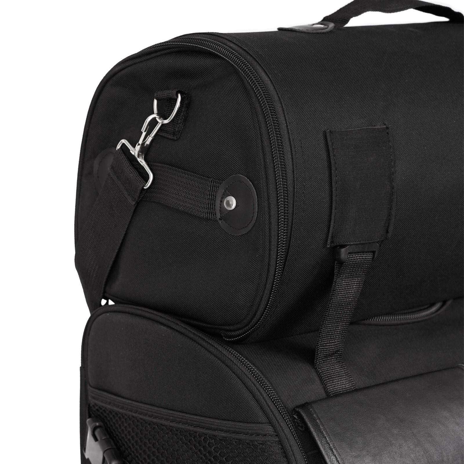 Top roll bag included for extra volume, straps on top of bag secure roll bag or strap down a jacket, or rain gear, etc.