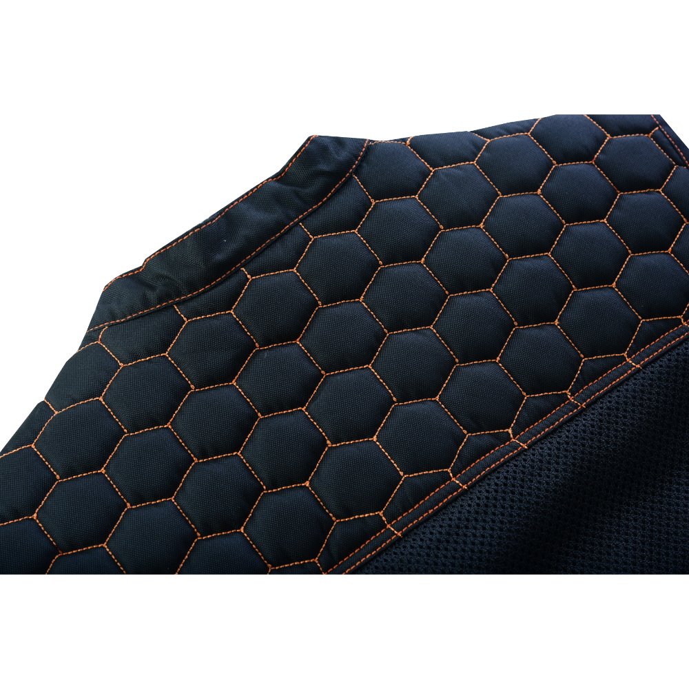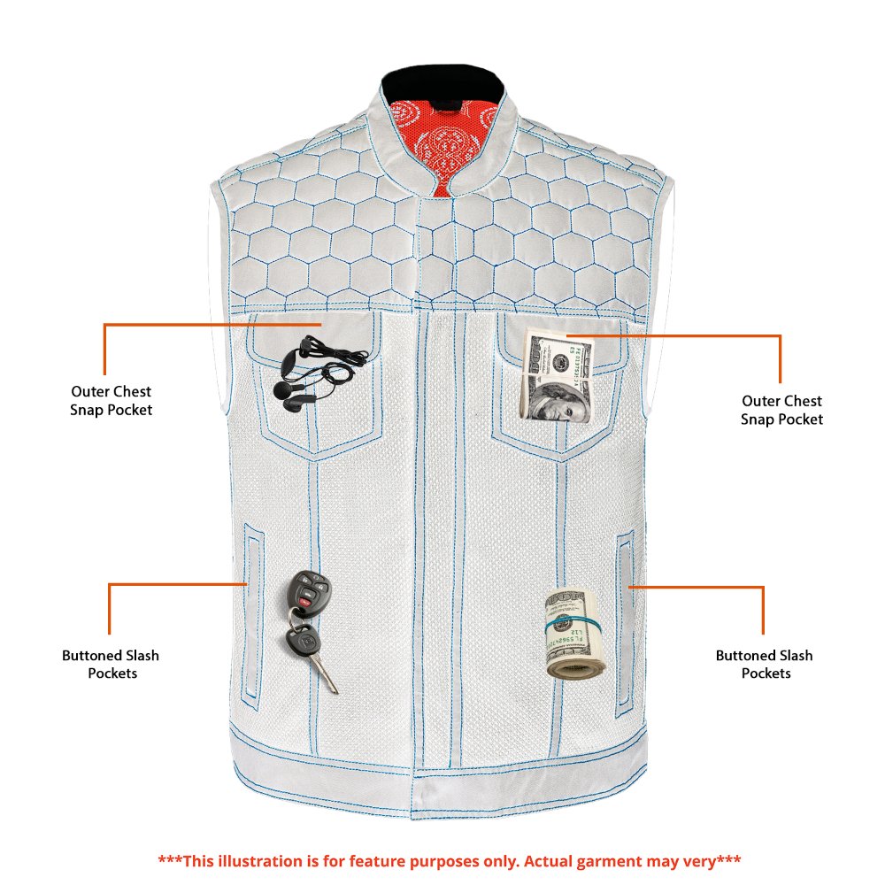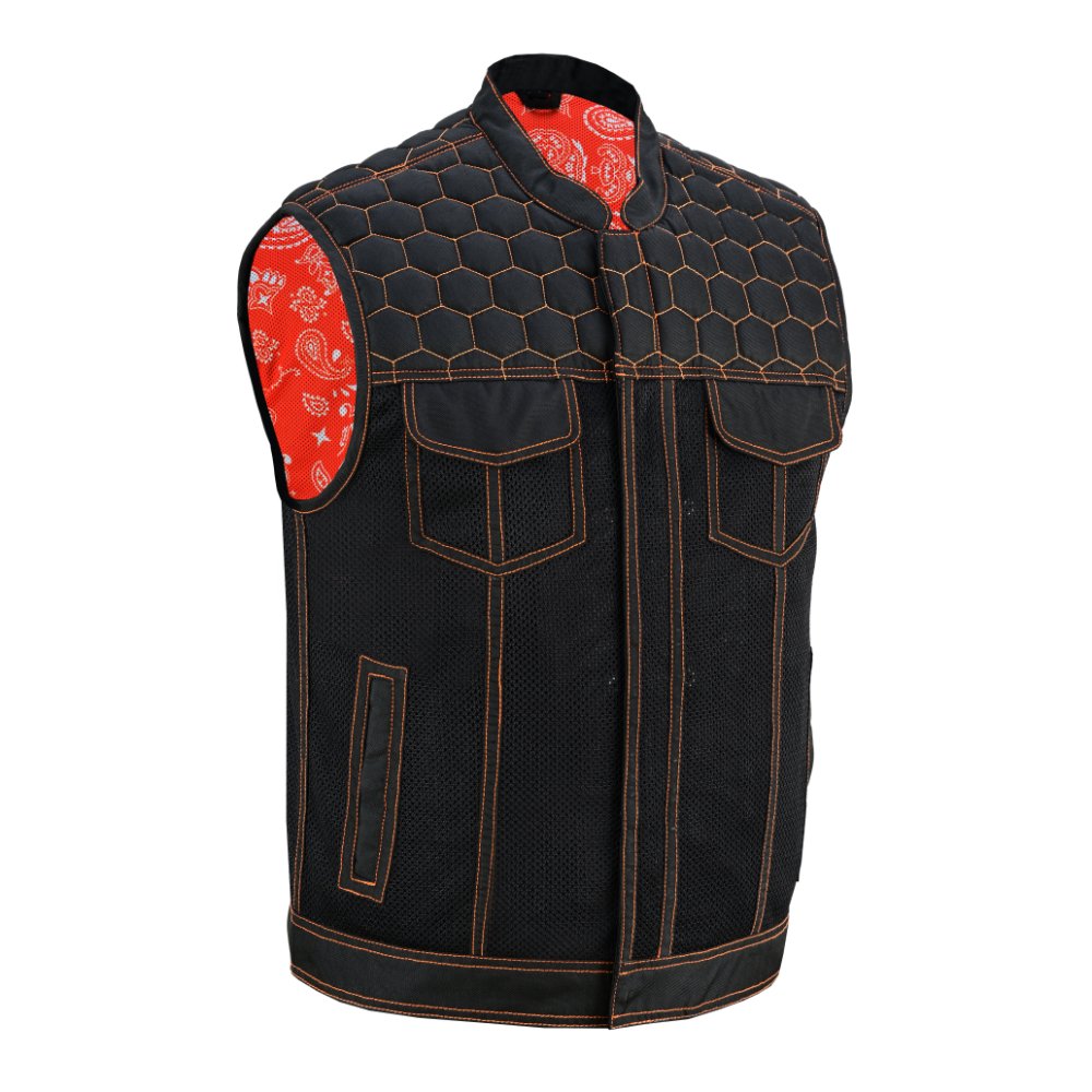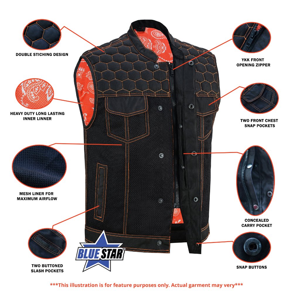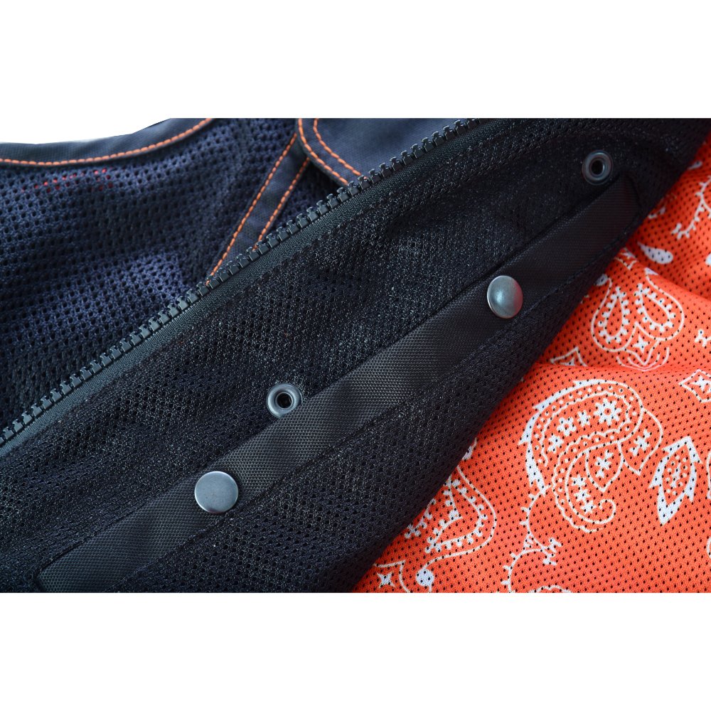 Our Night Tiger Black and Orange Mesh Textile Vest perfectly mixes style and functionality. It is a clubber-style Vest. The premium textile/mesh material enhances its breathability and durability. The blue honeycomb quilting with double stitching adds a unique and attractive touch, while the paisley-style sublimation inside adds more fuel to the overall look. The hidden zipper and snap-placket, with heavy-duty stitching and a built-in hanging loop, ensure ease of use. Perfect for the biker seeking fashion and Flexibility in their outerwear.