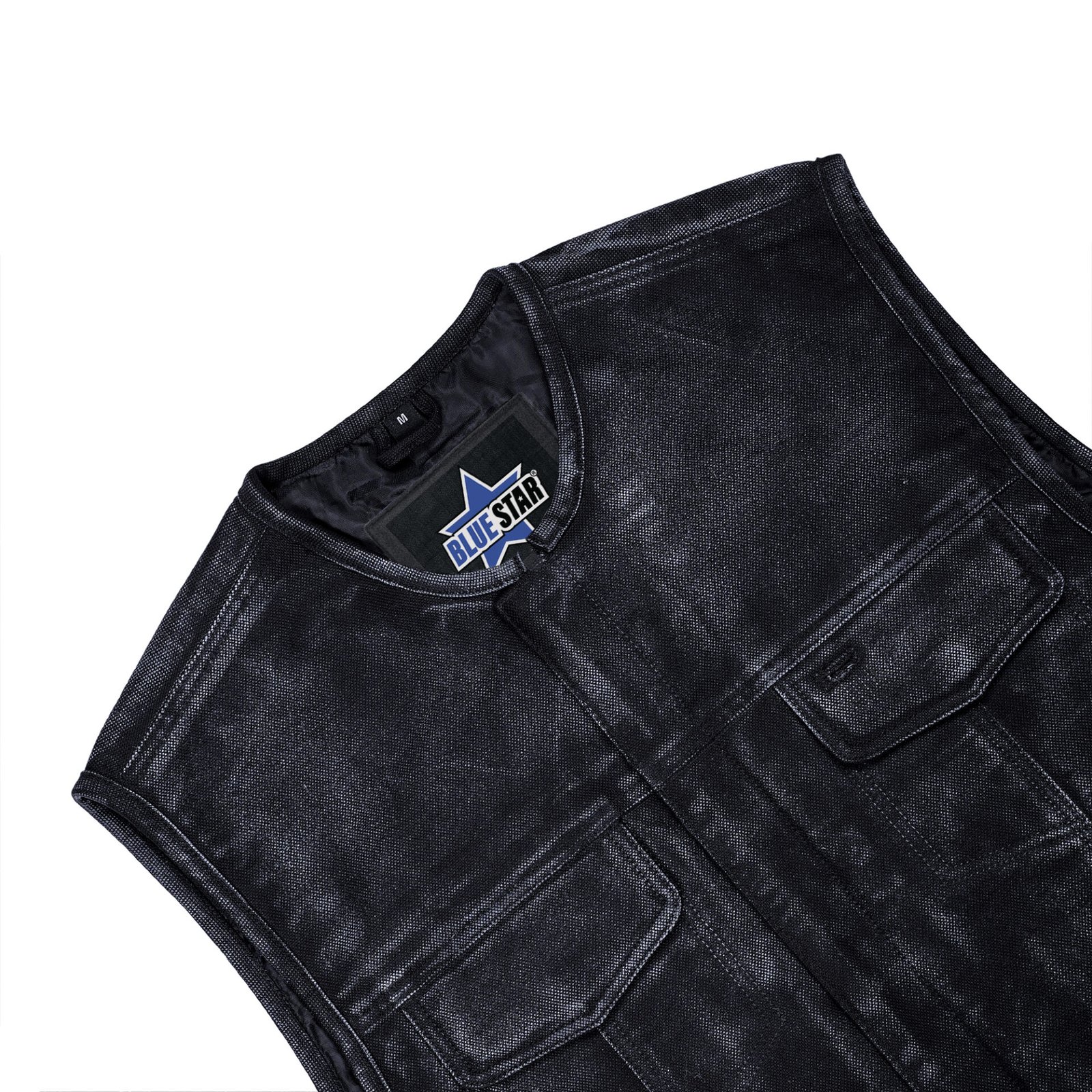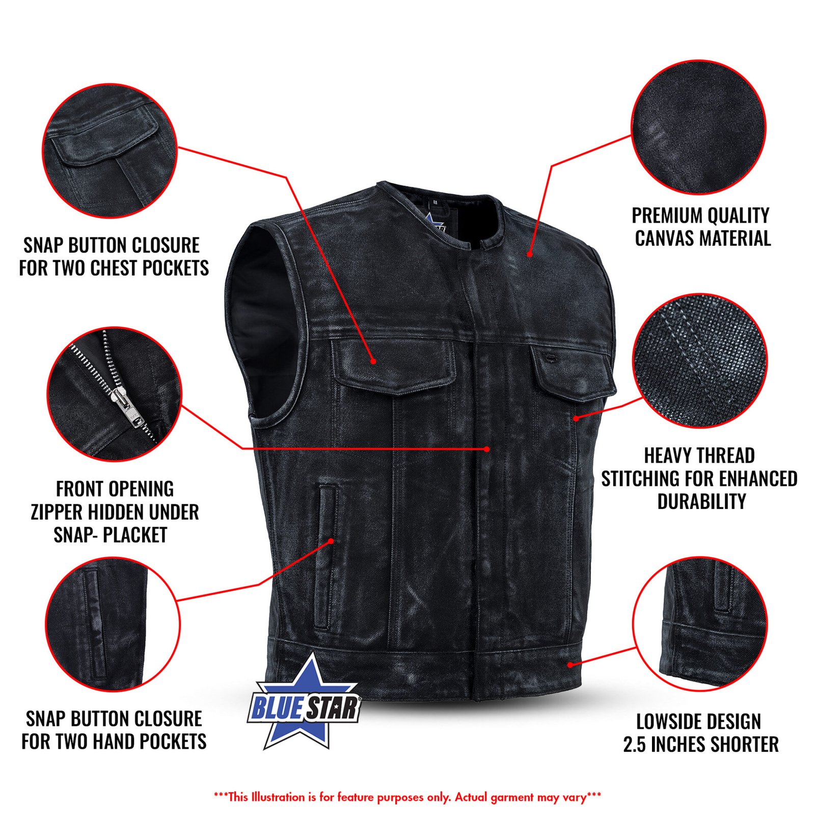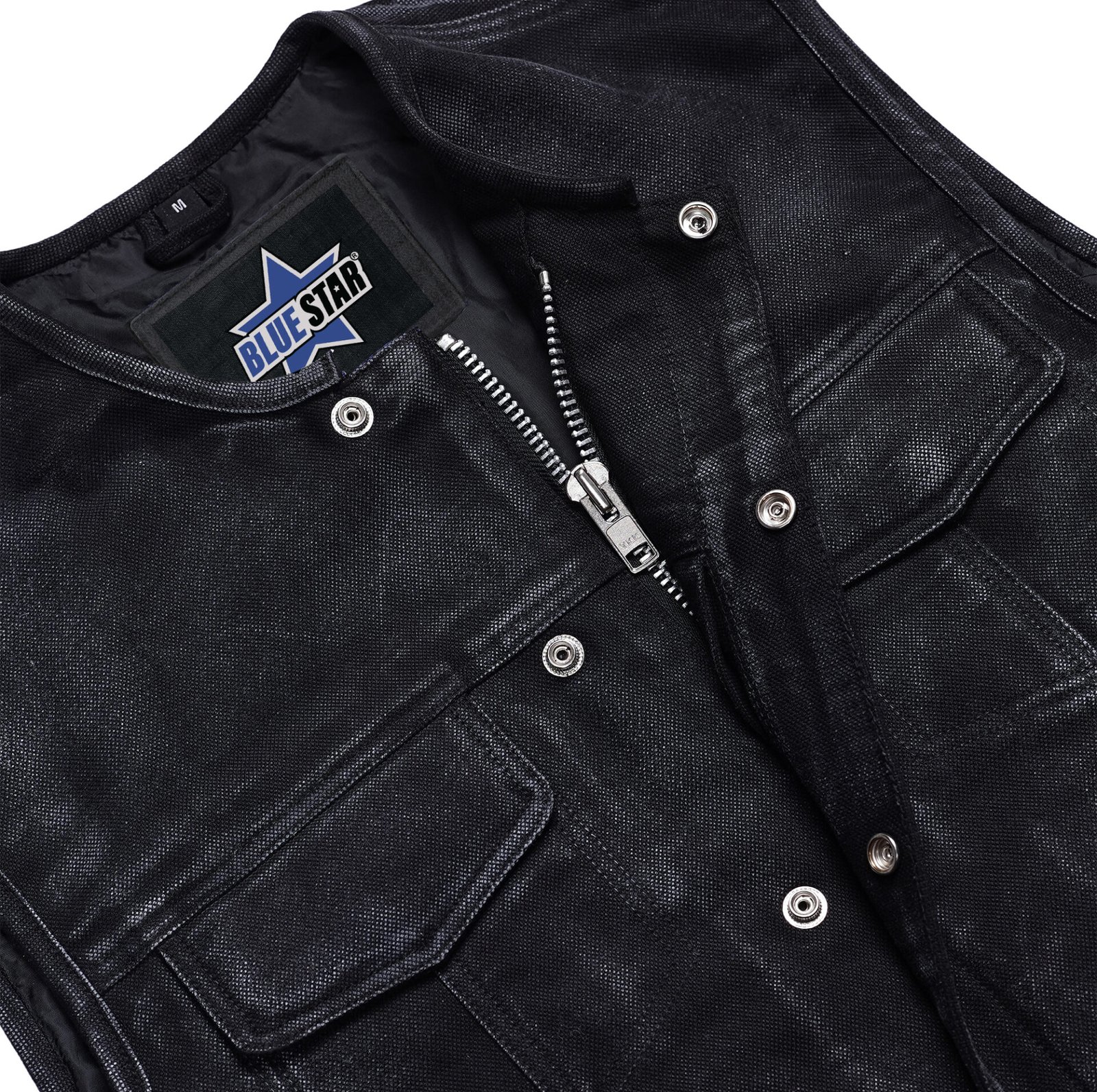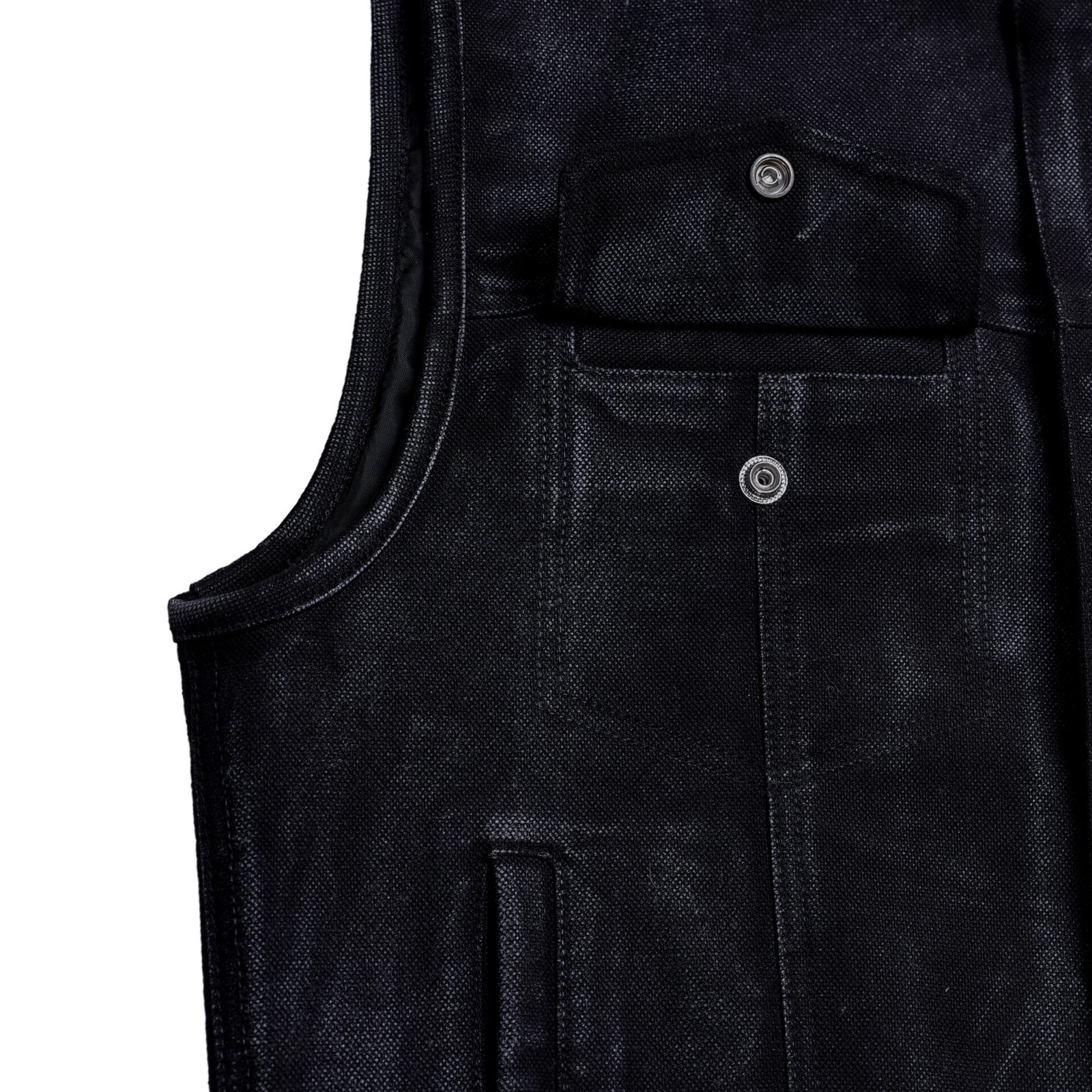looks. Made from premium Black canvas material with a wax finish, this vest offers an antique, weathered appearance that only gets better with time. The design features a
