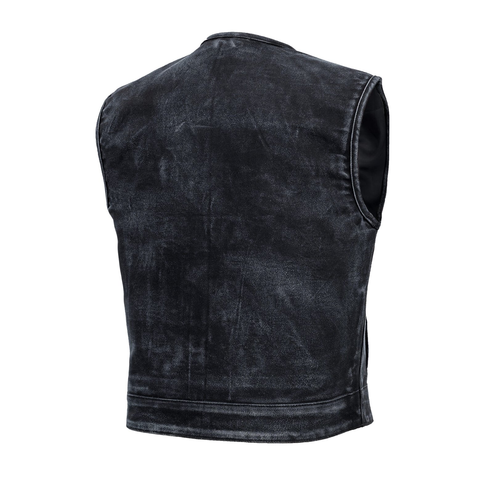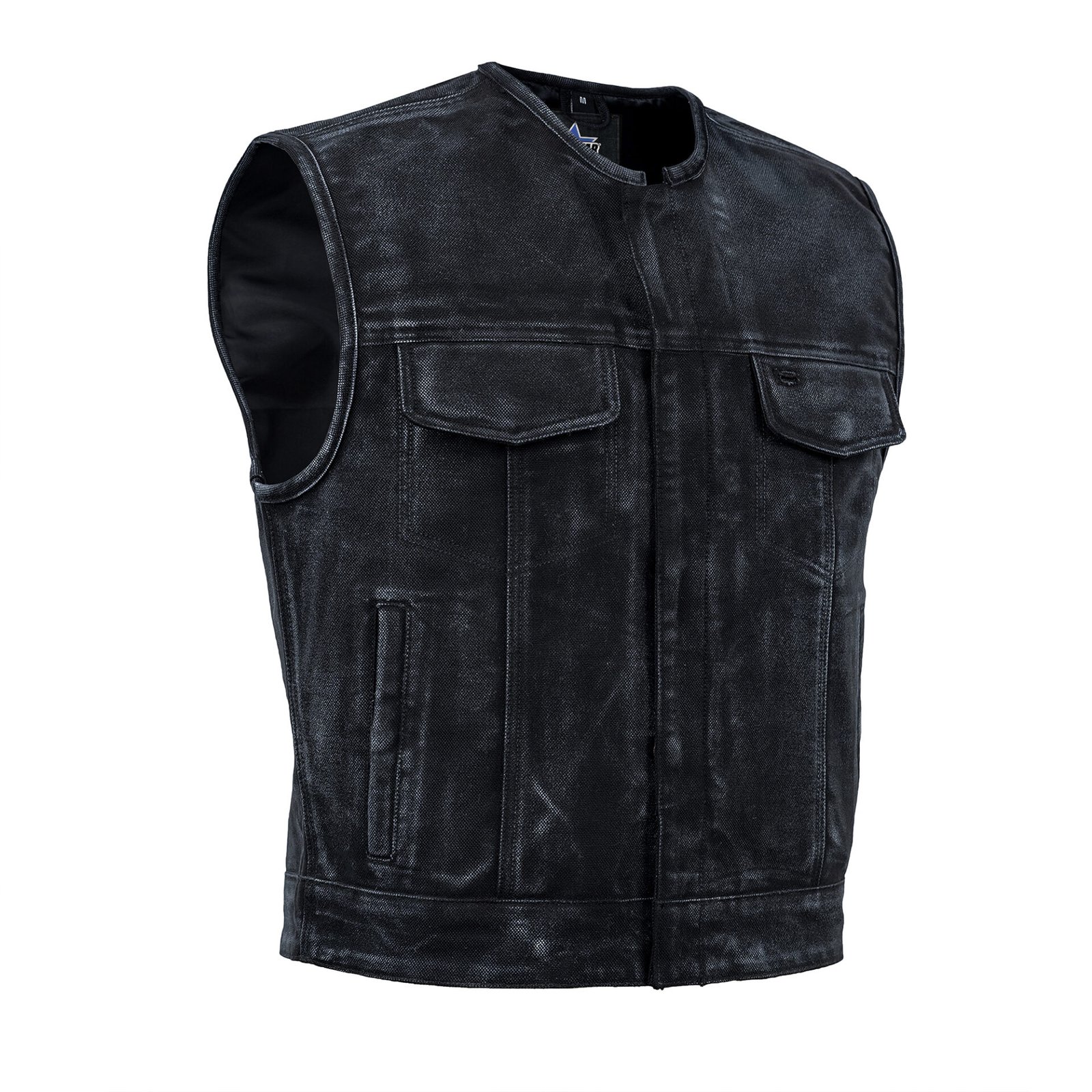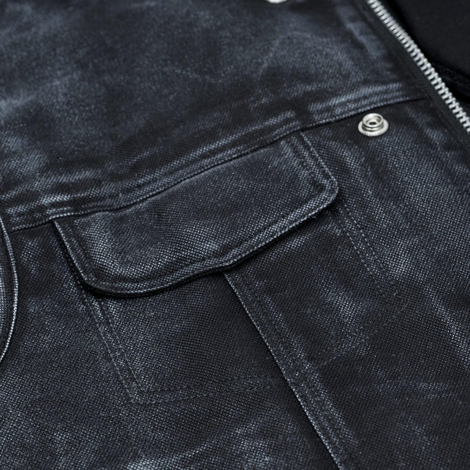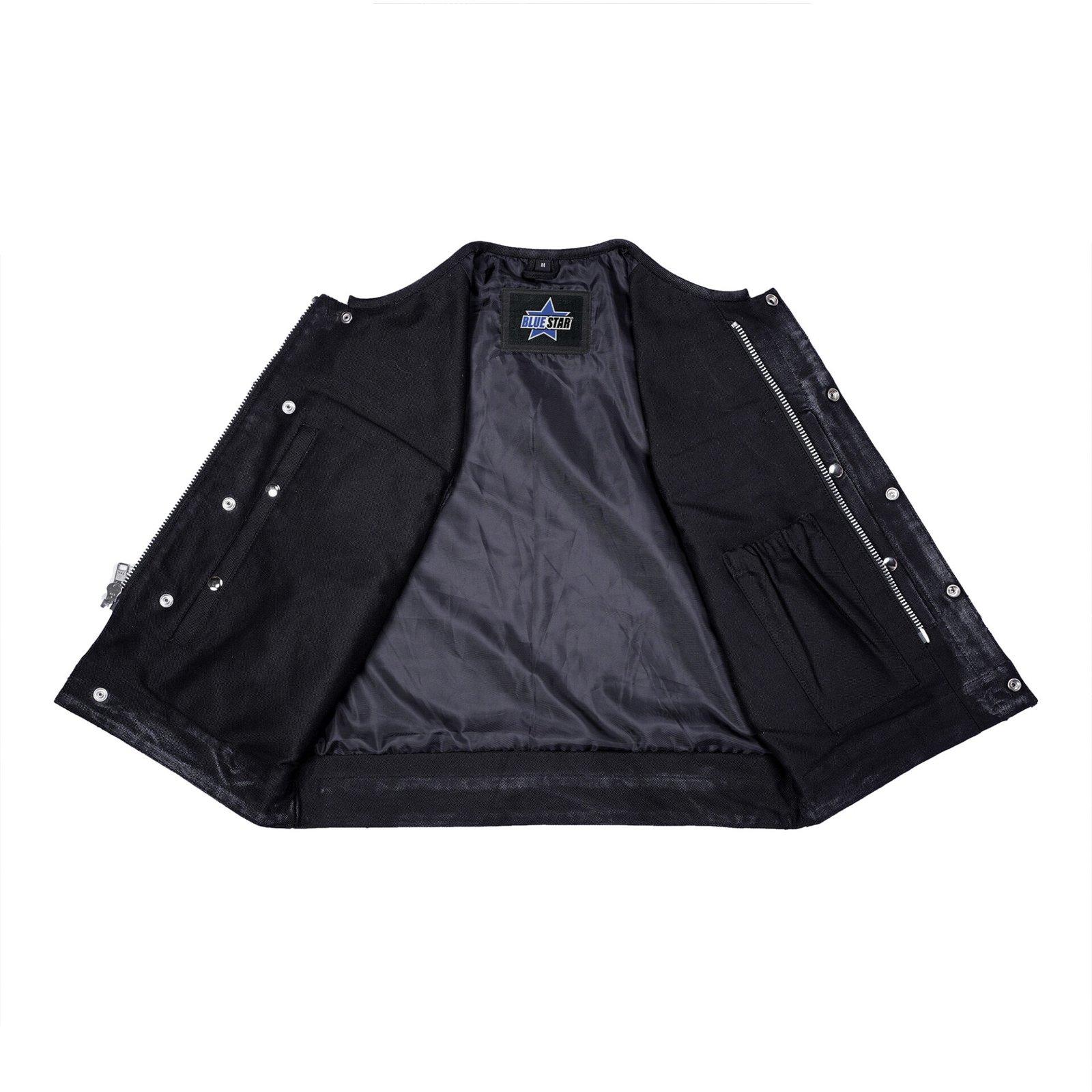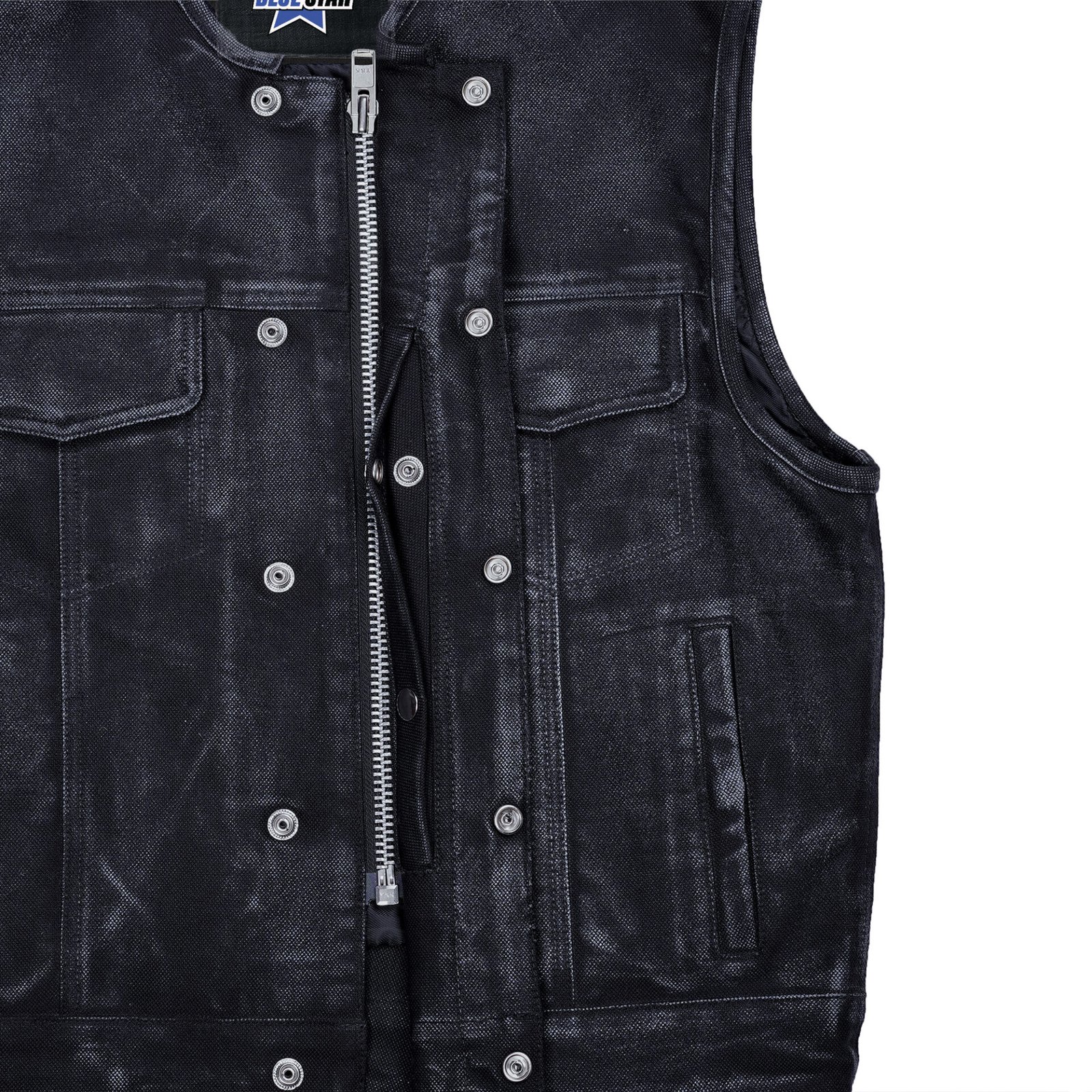looks. Made from premium Black canvas material with a wax finish, this vest offers an antique, weathered appearance that only gets better with time. The design features a