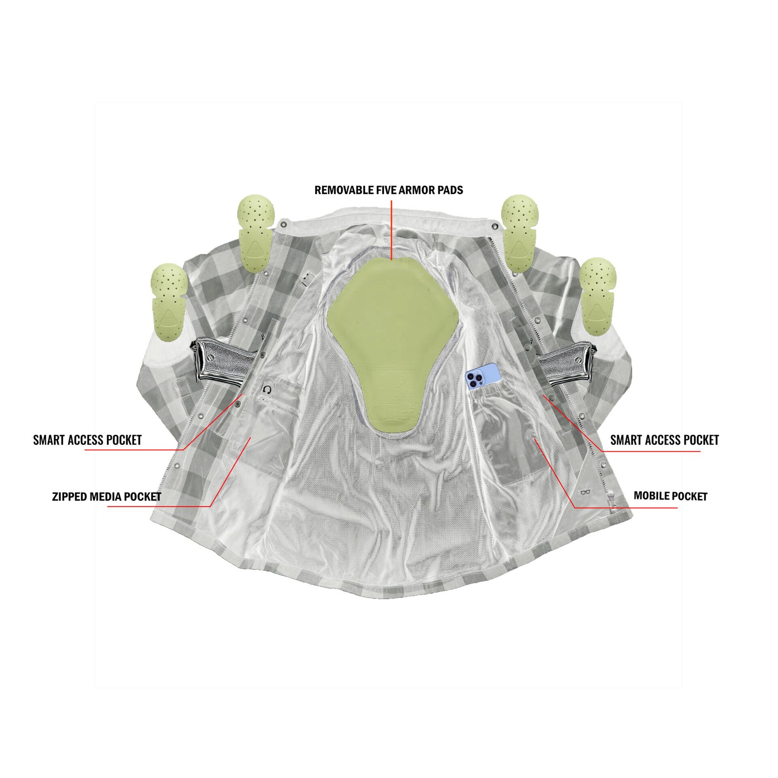 Removable Protection Pads pockets on shoulder, elbows, and back.