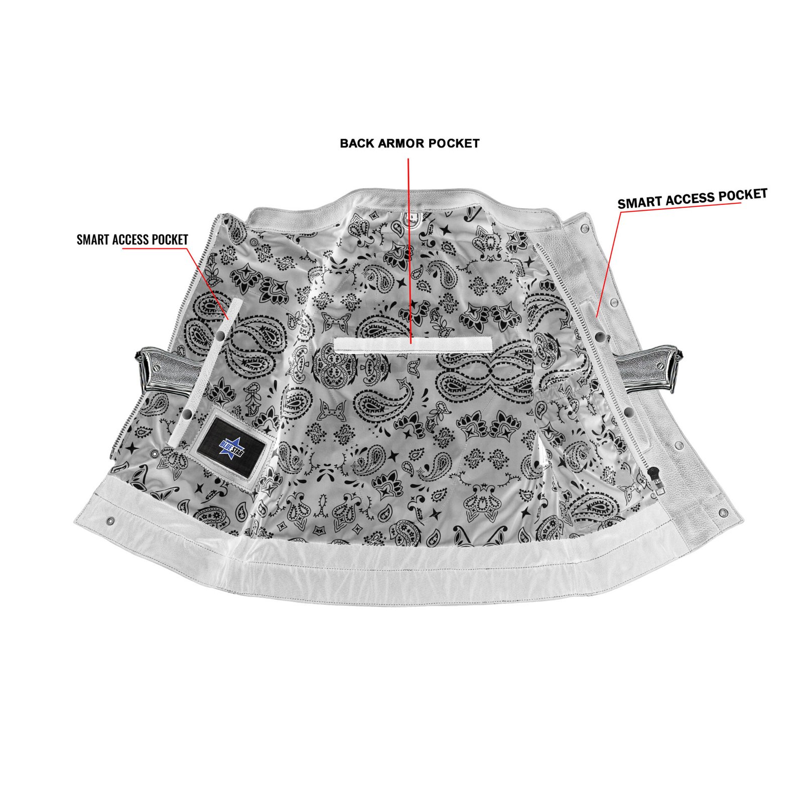 The Galaxy Grifter Women’s Leather Vest combines a rugged, time-worn aesthetic with a hidden cosmic surprise. It is crafted from premium leather with a heavy distressed finish. This vest features a vintage look accented by bold copper contrast stitching. The exterior speaks to a life on the road. The interior reveals a vibrant maroon paisley lining peppered with white stars. It offers a unique “galaxy” flair. Designed with a one-inch collar and a hidden front closure. This vest provides a streamlined silhouette that doesn’t compromise on its rebellious, outlaw spirit.