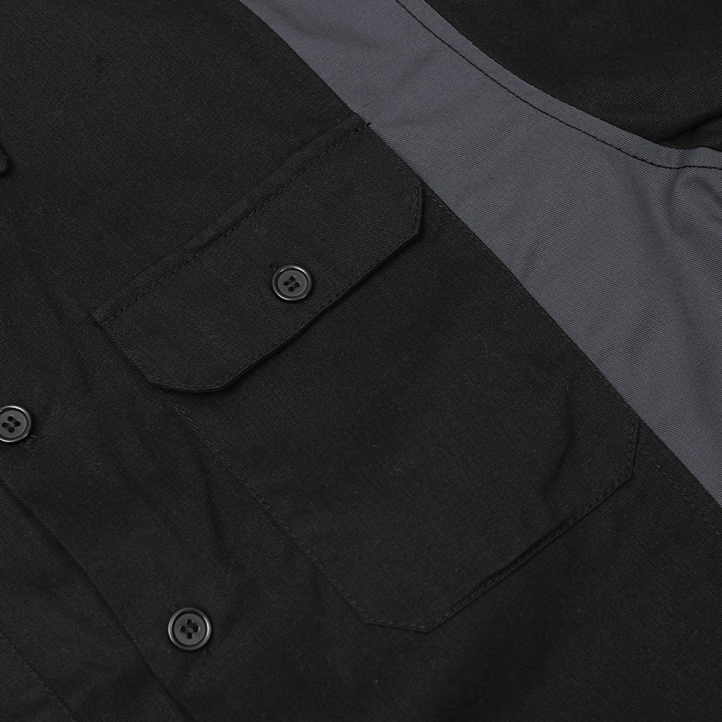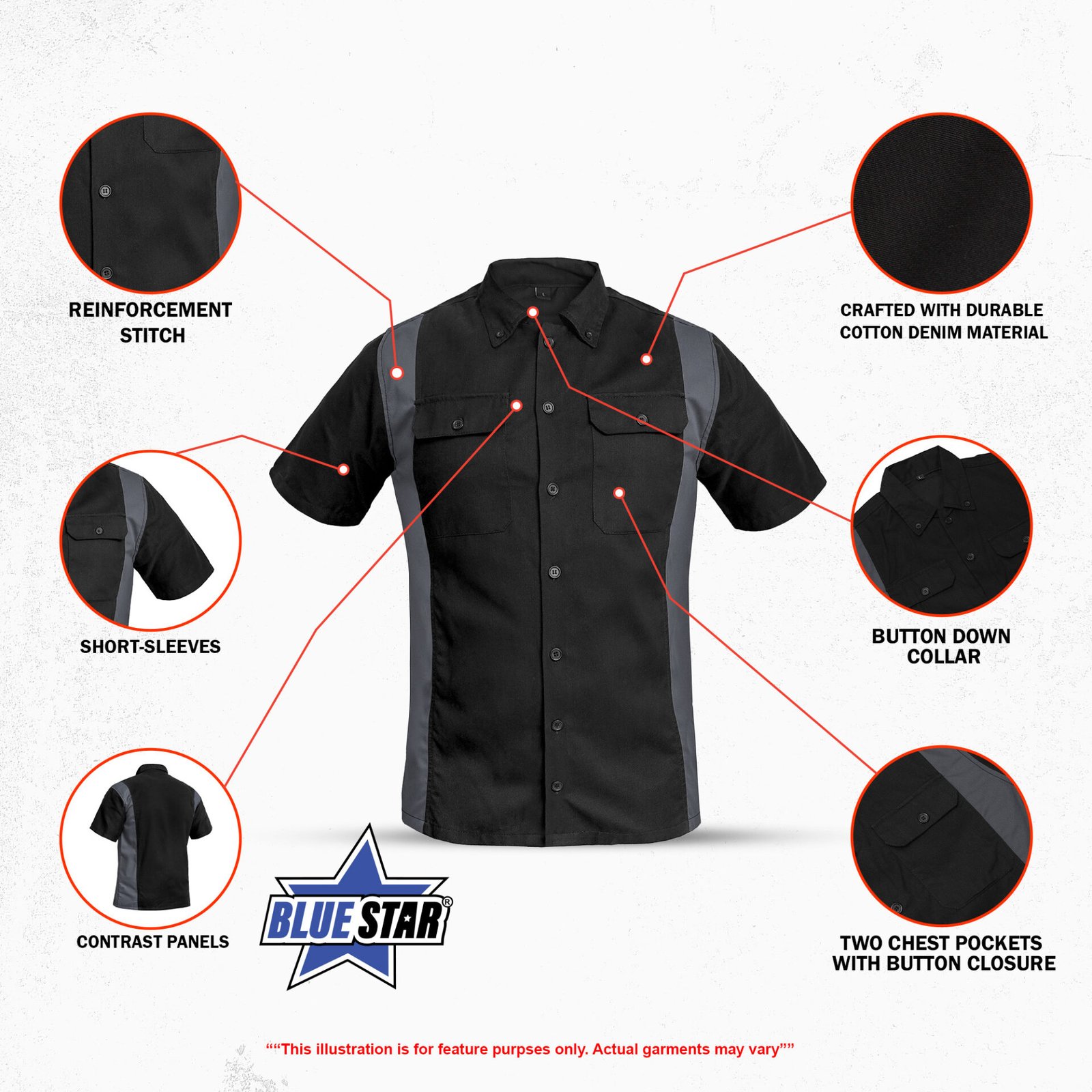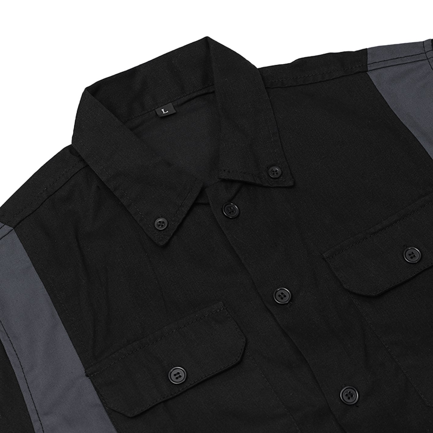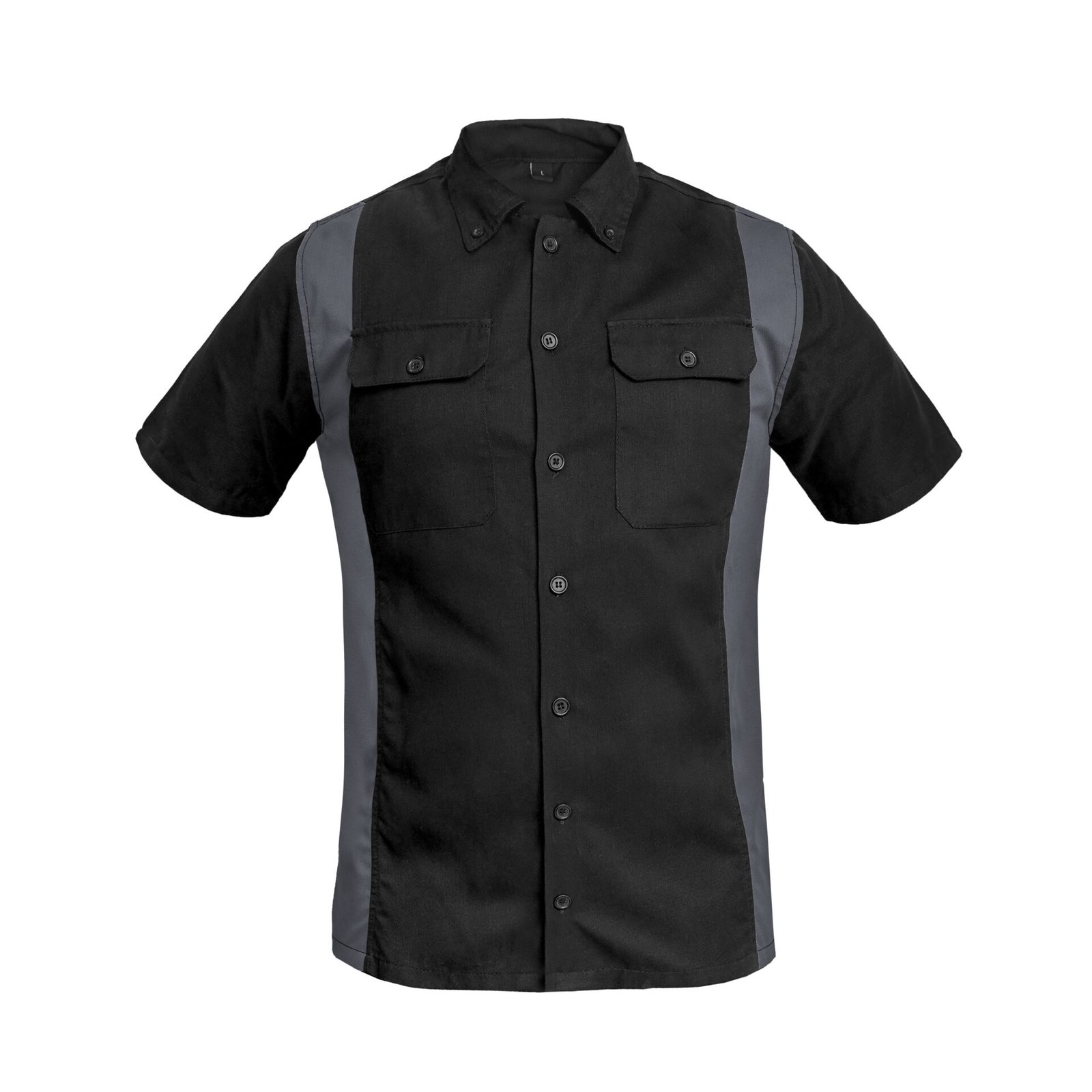 The Roadborne DualTone Cotton Work Shirt in Black & Gray delivers rugged style and practical durability. Black cotton jeans form the main body, back, sleeves, collar, and chest pockets, while gray side panels add subtle contrast along the front and back. Short sleeves keep it cool on the job, and a button-down collar with plastic buttons offers a secure fit. Two chest pockets with flap closures carry essentials, and a full front button closure ensures ease of wear. Reinforced stitching strengthens every seam. Designed to withstand heavy use, it’s ready for patches, embroidery, or company branding. True to size, built for daily wear.