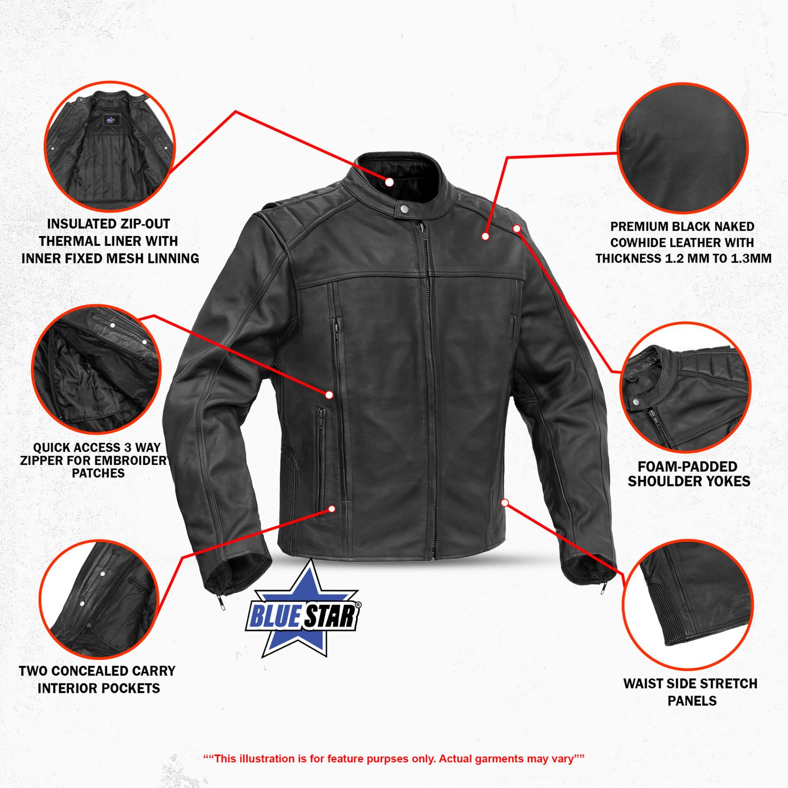 The jacket includes a removable insulated thermal liner with breathable mesh, zippered hand pockets, concealed carry pockets, and a cell phone pocket with wire access. Heavy-duty YKK zippers, metal hardware, and reinforced stitching ensure long-lasting performance, making it ideal for serious riders.