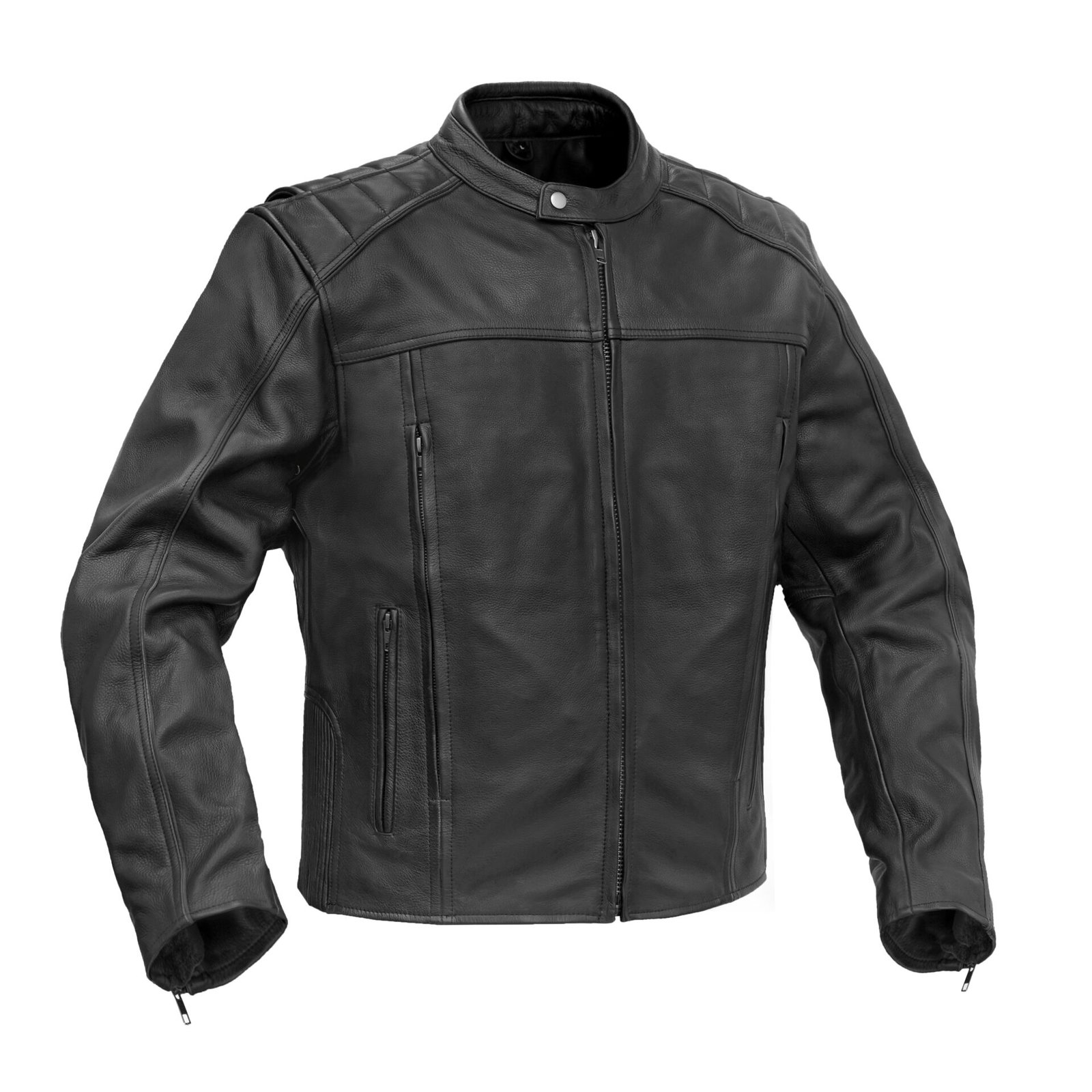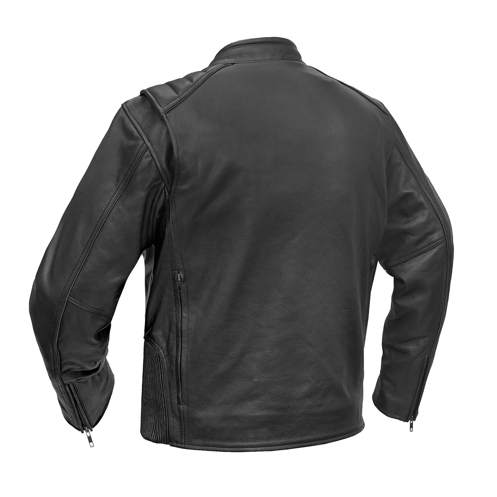 HellBorn Men’s Leather Motorcycle Jacket is built from premium black cowhide for durability and protection. It features a center front zipper, a rolled mandarin-snap collar, foam-padded shoulders, and armor pockets at the shoulders, elbows, and back. Reflective piping, zippered vents, action back gussets, and stretch panels improve visibility, airflow, and freedom of movement.