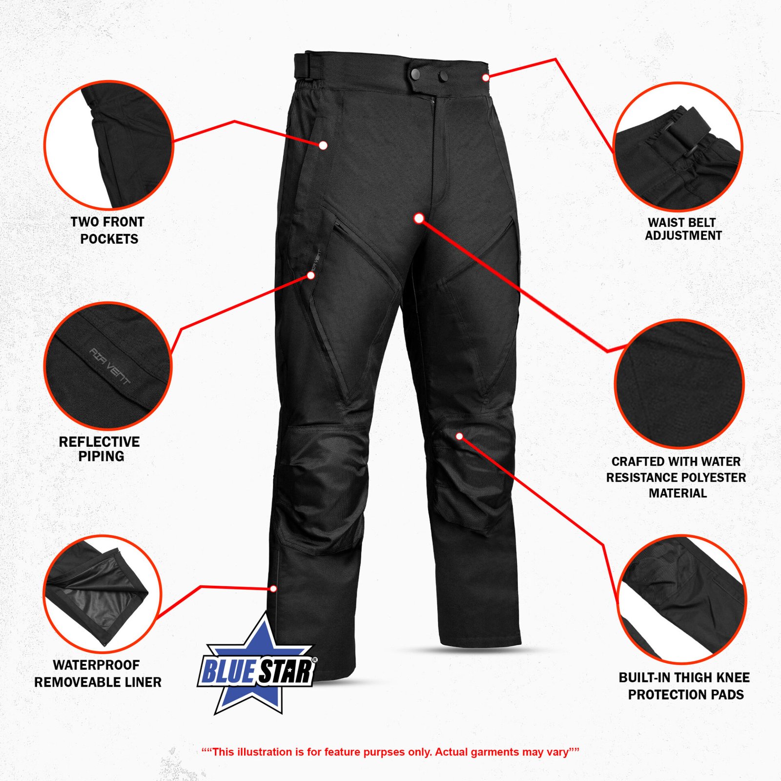 Better control, safety, and comfort on every ride with STRYDR Men’s Textile Motorcycle Pants. Built for riders who need reliable protection and all-weather performance, these pants deliver a secure fit with adjustable features and a grip-enhanced seat area for improved stability on the bike. Removable thigh and knee pads add impact protection where it matters most. Ventilation pockets support airflow during long rides, while reflective piping improves visibility in low-light conditions. A jacket connection zip keeps your gear secure and aligned. Water resistance helps you stay dry in changing weather, and over-boot ankle zips make them easy to wear with riding boots. Ideal for daily commuting and long-distance touring.