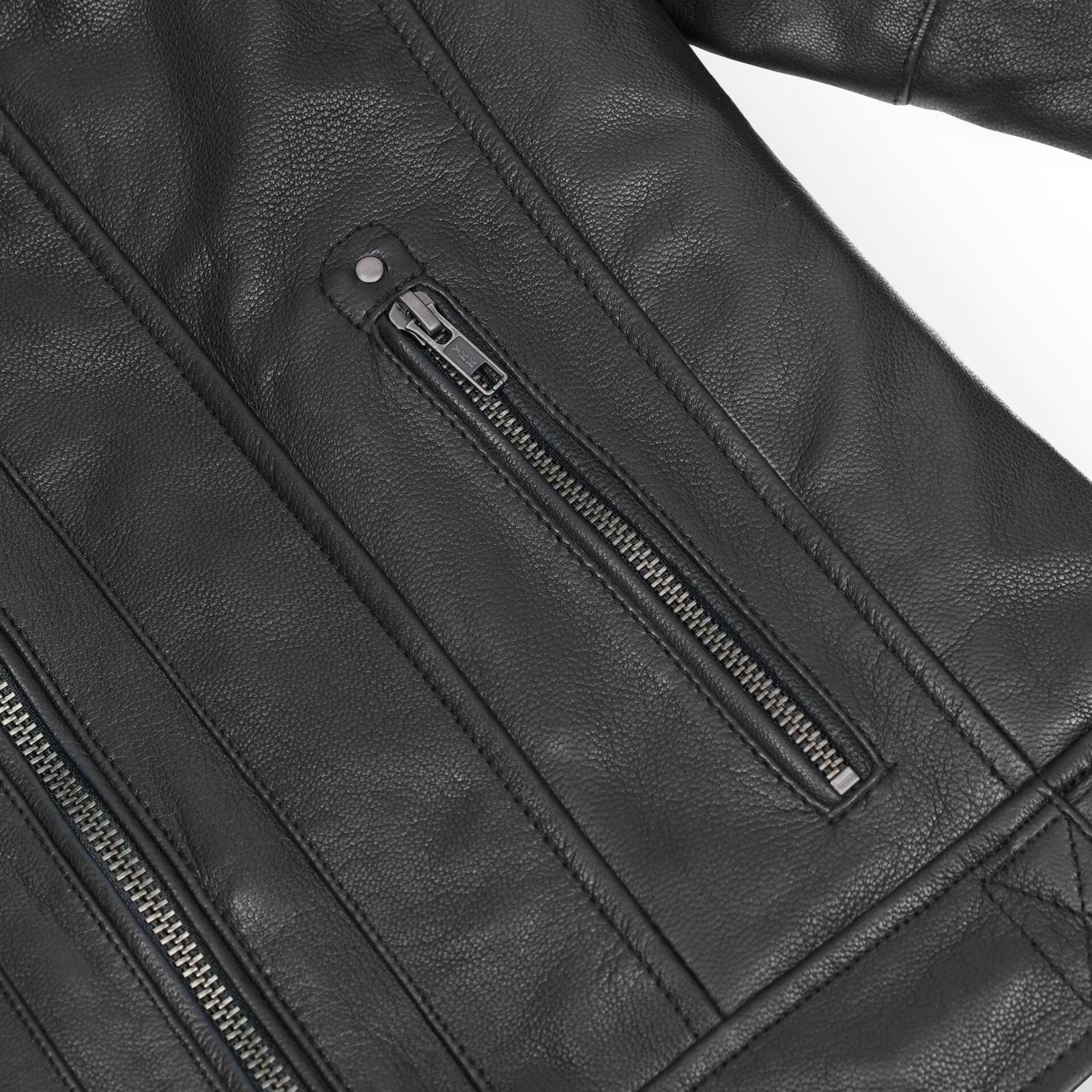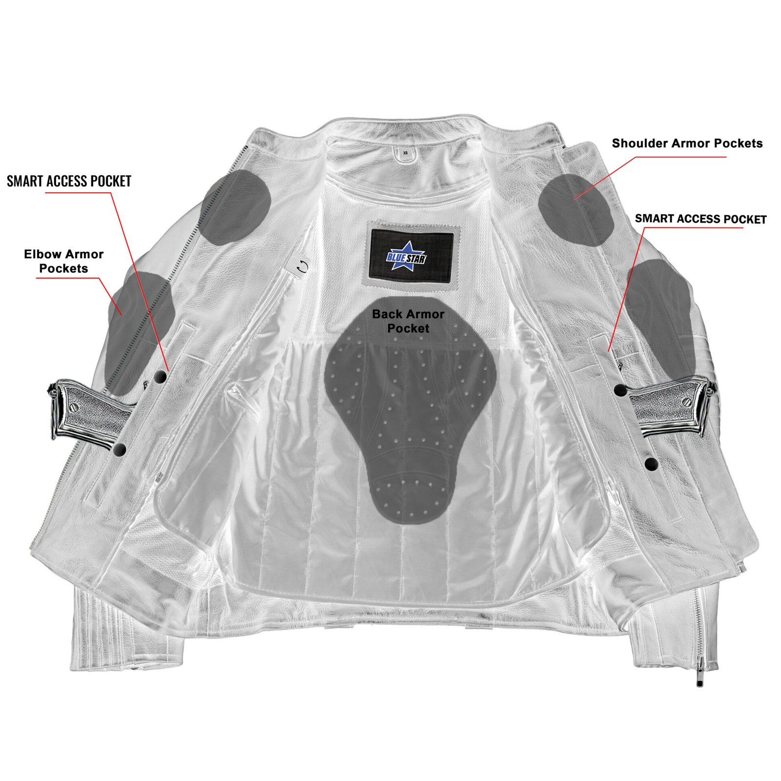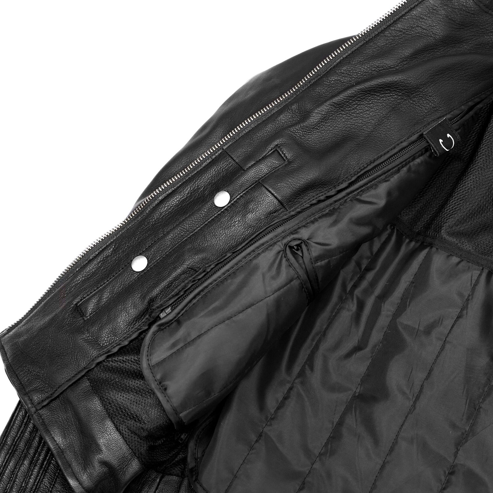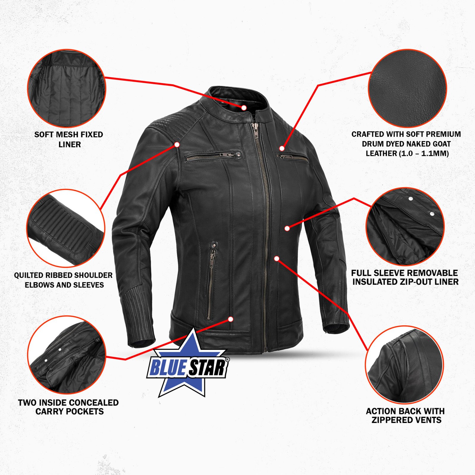 Made from ultra soft premium drum dyed naked goat leather (1.0–1.1mm), jacket features banded collar with center metal zip closure, foam-filled ribbed detailing on shoulders, elbows and lower back, full sleeve removable insulated zip-out liner, zippered sleeves with gusset, two zippered chest vent pockets, two zippered slash pockets, YKK front zipper opening, CE-2 rated armor pockets at shoulders, elbows and back, two inside concealed carry pockets with built-in holster and snap closure, soft mesh fixed liner, strong thread reinforced stitching and hanging loop, action back with zippered vents, lower back ribbed quilting for durability and riding comfort protection performance design