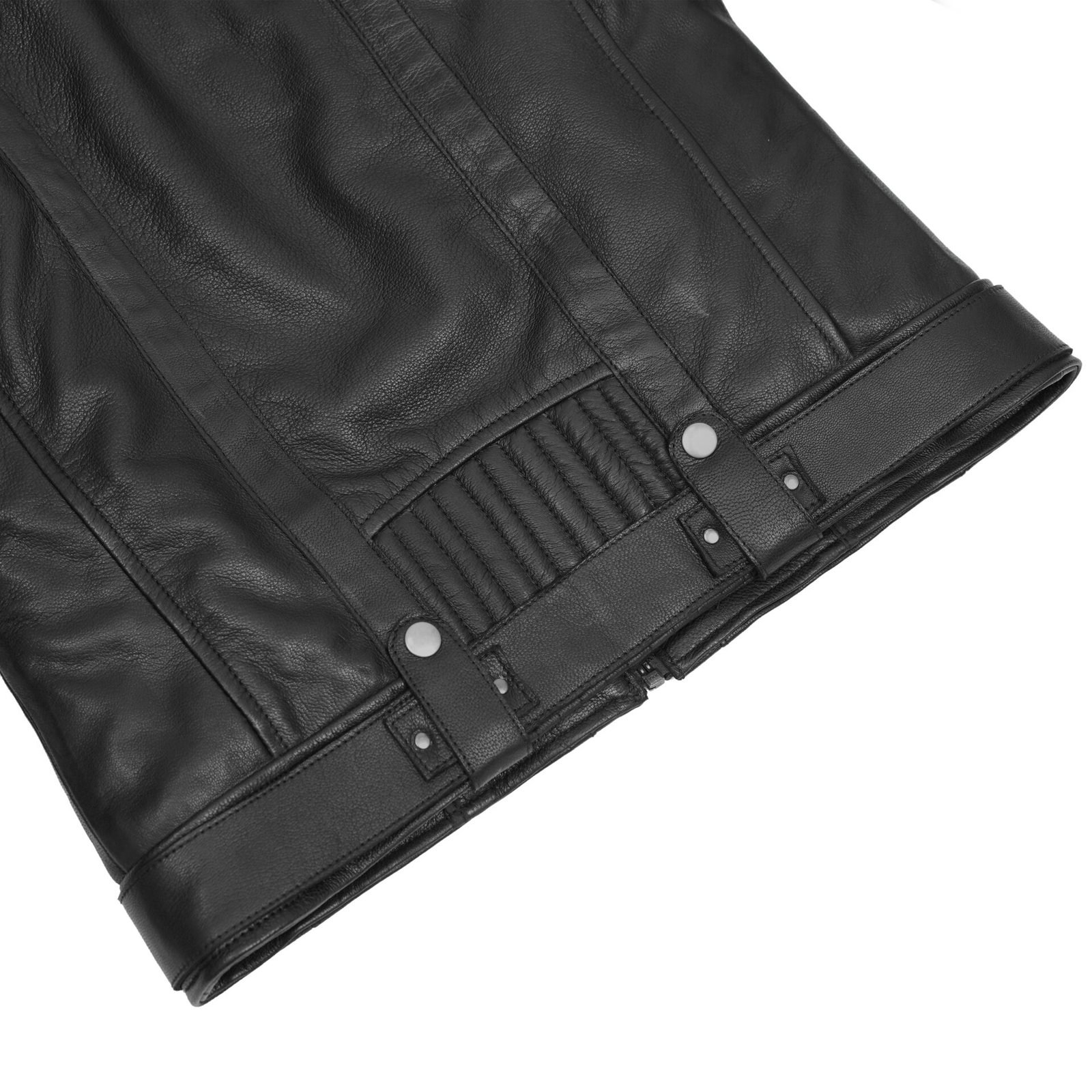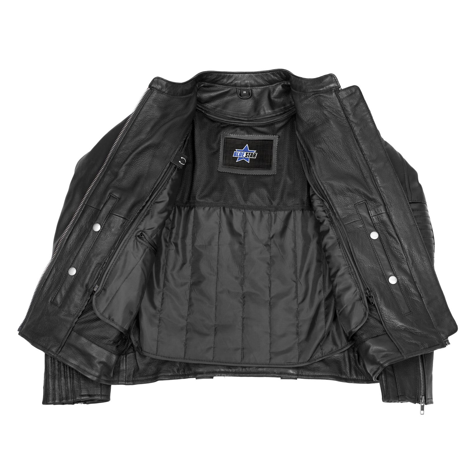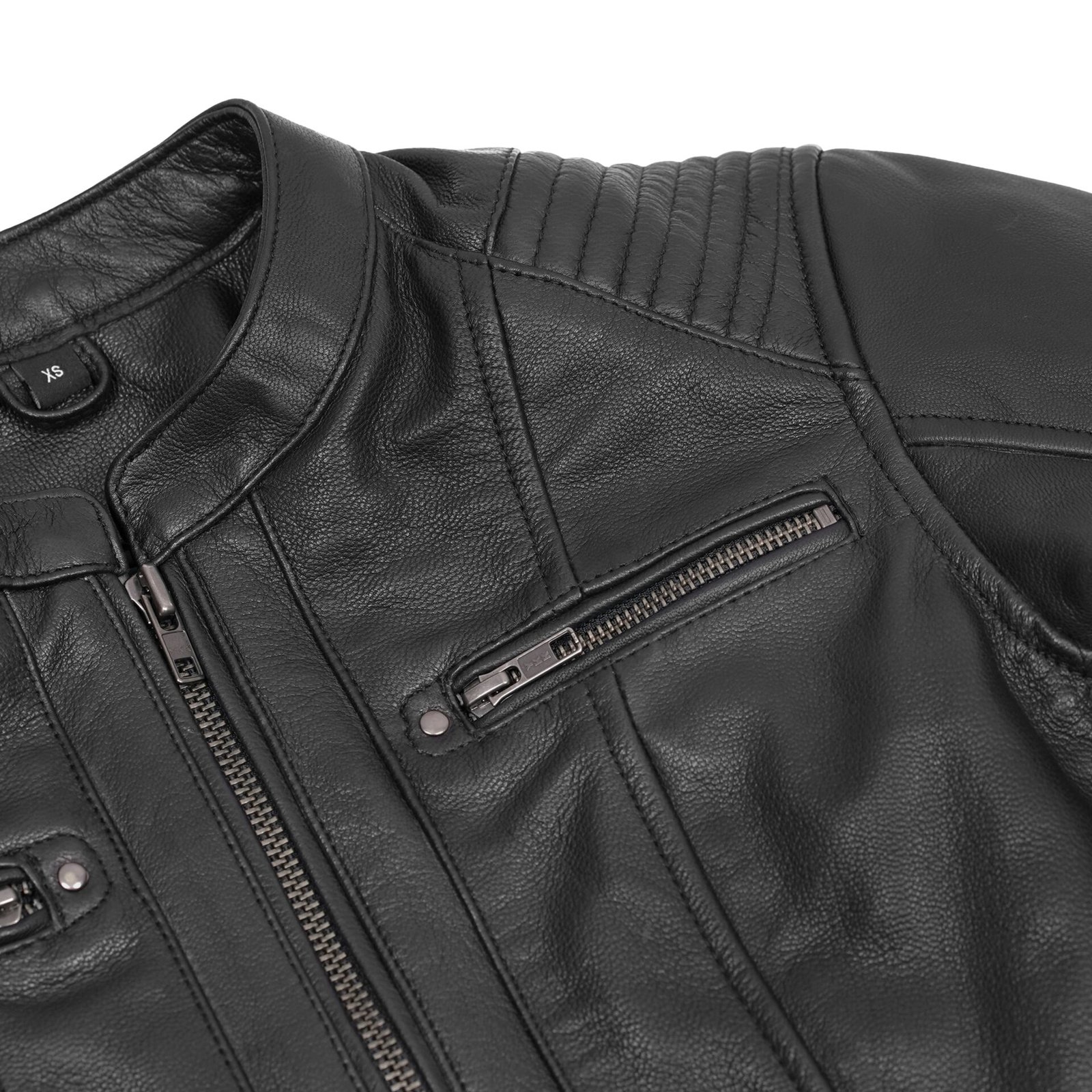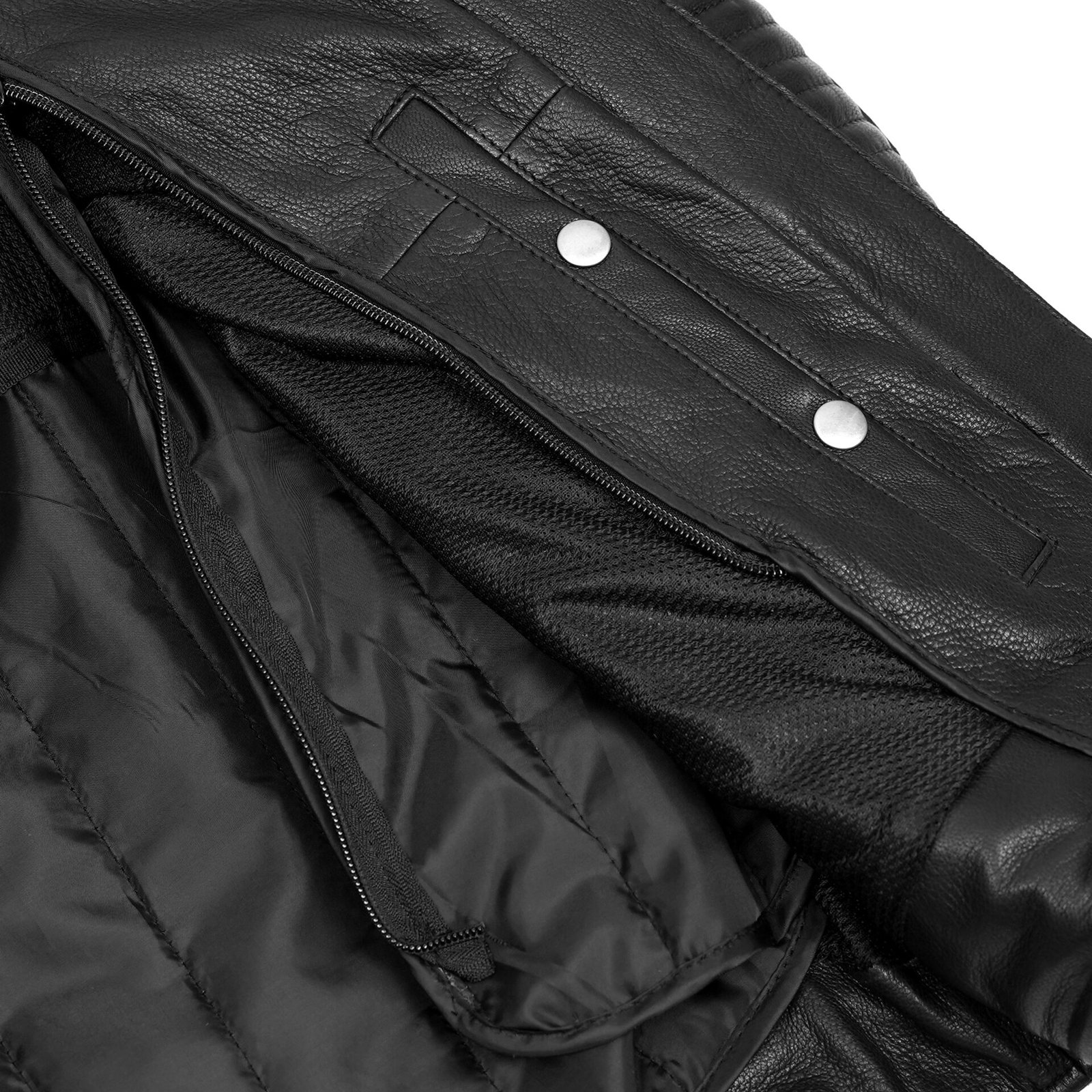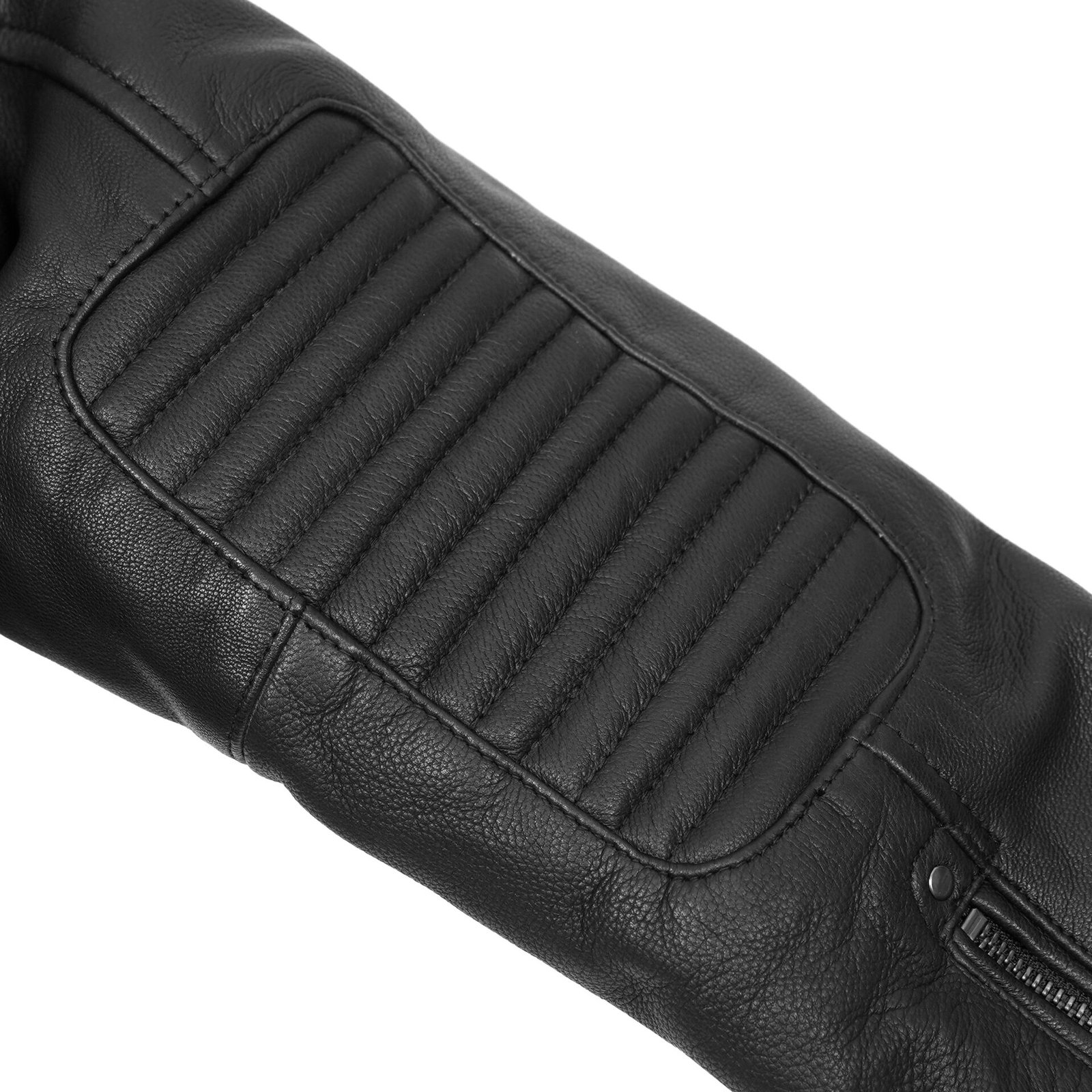 Made from ultra soft premium drum dyed naked goat leather (1.0–1.1mm), jacket features banded collar with center metal zip closure, foam-filled ribbed detailing on shoulders, elbows and lower back, full sleeve removable insulated zip-out liner, zippered sleeves with gusset, two zippered chest vent pockets, two zippered slash pockets, YKK front zipper opening, CE-2 rated armor pockets at shoulders, elbows and back, two inside concealed carry pockets with built-in holster and snap closure, soft mesh fixed liner, strong thread reinforced stitching and hanging loop, action back with zippered vents, lower back ribbed quilting for durability and riding comfort protection performance design