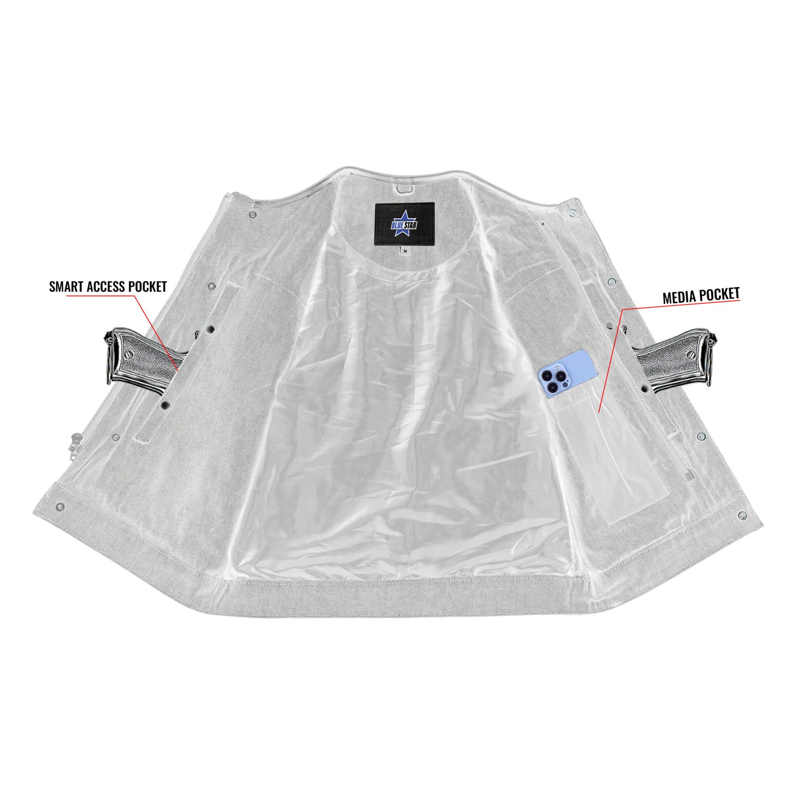 • 2 upgraded style concealed gun pockets between the snap and the zipper made of special heavy duty textile with built-in holsters and snap closure.