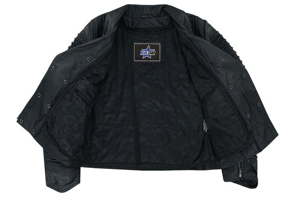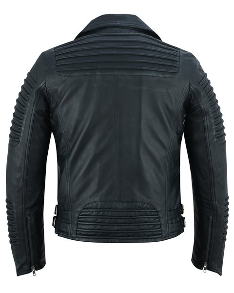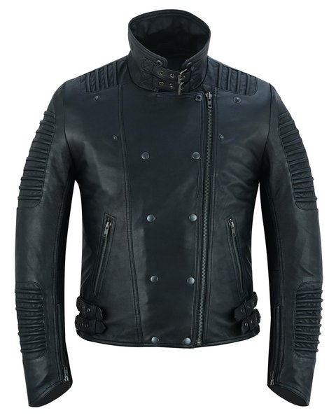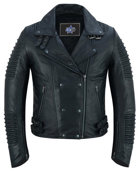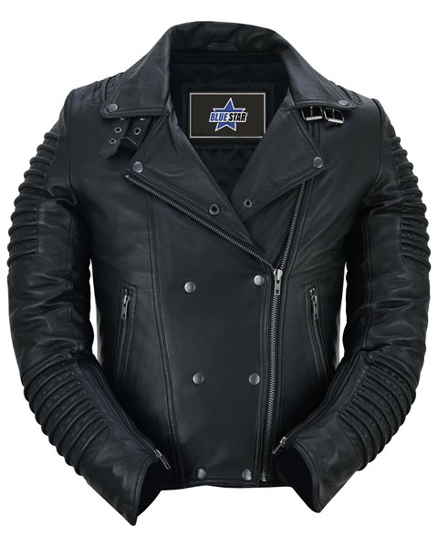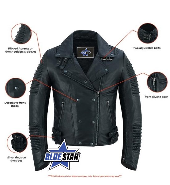 - Our precisely crafted leather jacket blends optimal protection with rugged style, featuring specific leather thickness, ribbed accents, and adjustable belts.