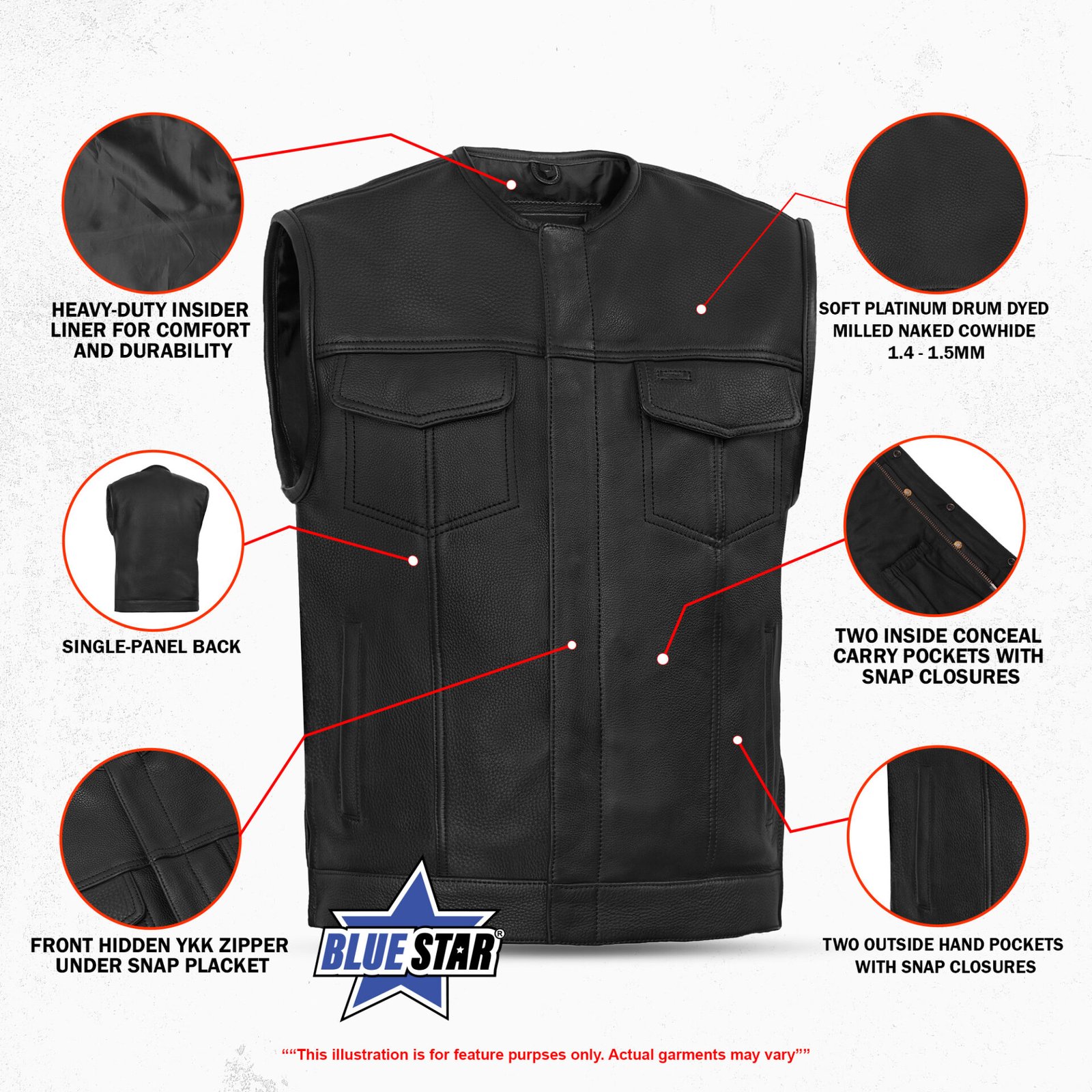 Leather vests offer mobility and security for those who carry guns on the road. Our mens gun pocket vest with bottom side zippers is perfect for bikers who want to conceal carry on or off their bike. Our vests are made of soft, premium drum-dyed milled naked cowhide 1.4-1.5 MM for comfort and durability.