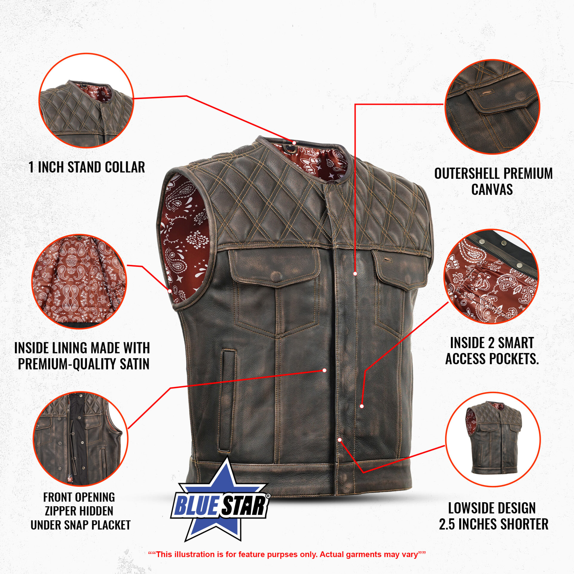 The Liberty Knight Men’s Leather Vest is built for those who value rugged strength and timeless appeal. Crafted from premium brown leather, the complete outer shell provides superior durability and a rich, natural finish that ages beautifully over time. Whether you’re on your bike or off the road, this vest offers the toughness and sophistication every rider needs. A vintage ruff finish on the outside combined with a paisley-designed inner lining gives it a classic yet bold character. The single-panel back is perfect for personal customizations like patches or club logos. The front is equipped with a 24″ original YKK metal zipper concealed under a secure snap-placket to guard against wind and rain, ensuring both functionality and style. Equipped with snap-button closures on two hand pockets and two chest pockets, the vest ensures your belongings stay safe and accessible. Inside, you’ll find dual gun pockets reinforced with heavy-duty materials and elastic holsters for firearms and magazines—designed with reinforced shoulder support for added strength and structure. Attention to detail is what makes the Liberty Knight stand out—from the 1″ Velcro closure on the mobile pocket to the 6″ and 1.5″ elastic bands used for holster and magazine storage. Finished with heavy-thread stitching for long-lasting wear, this vest is more than just a statement—it’s built for the road and the rider.