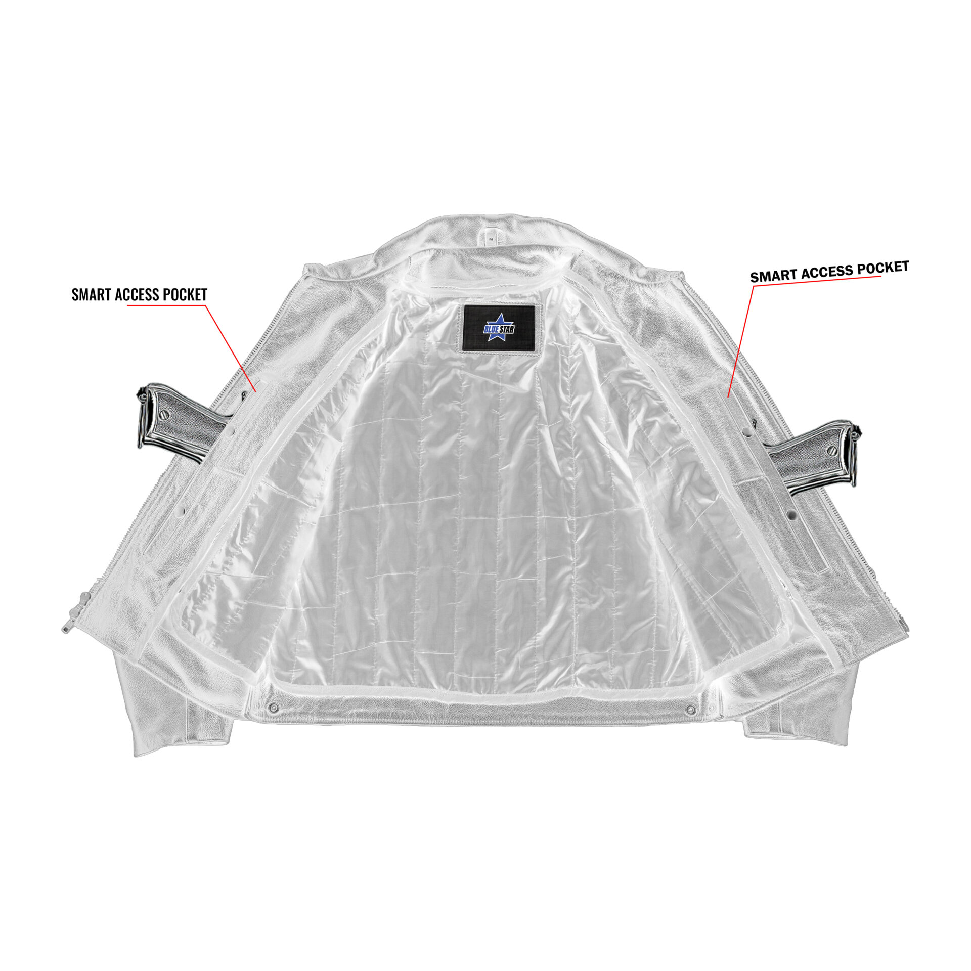 The Dark Rebel Men’s Motorcycle Jacket combines rugged and unmatched style. It is crafted from superior black leather. It offers lasting strength and a bold, commanding look. Its two way central zipper which make sure secure closure and flexibility, whereas concealed carry pockets with integrated magazine holsters add functional utility. A removable double sided quilted liner, and durable Korean lining deliver comfort in all season. Exterior pleated chest pockets, snap-down collar, shoulder flaps and leather badge tab with metal eyelets. It improve its police-inspired fashion. Action back design, adjustable side buttons, heavy-duty YKK zippers, reinforced stitching, and a hanging loop complete this versatile, rider-ready jacket.